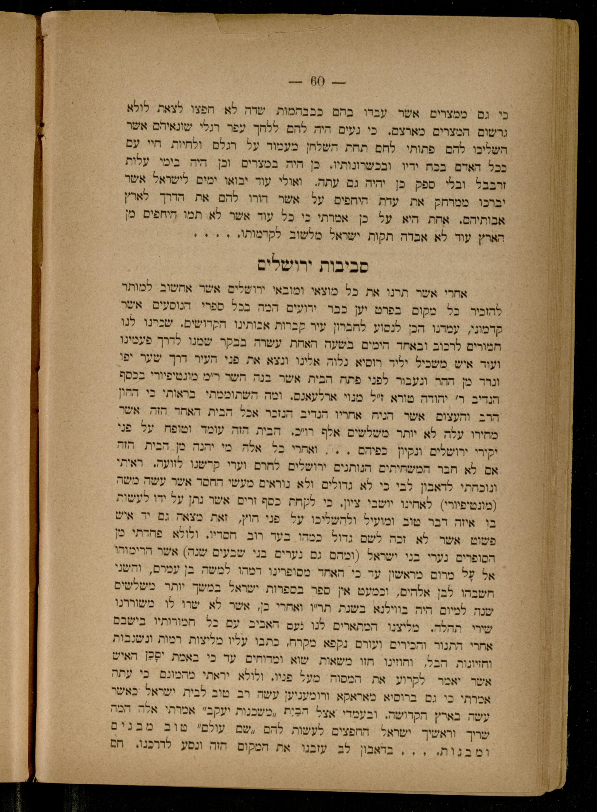 אחרי אשר תרנו את כל מצאי ומובאי ירושלים. אשר אתשוב. למותר להזכיר כל מקום בפרם יען כבר ירועים המה בכל ספרי. הנוסעים אשר קדמוני,, עמדנו הכן לנסוע לחברון עיר קברות אבותינו הקרושים.. שברנו לנו חמורים לרכוב ובאחד הימים. בשעה האחת עשוה בבקר שמנו לררך פעמינו ועוד איש משכיל יליר רוסיא נלוה אלינו ונצא את פני העיר דרך שער יפו ונרד מן ההר ונעבור לפני פתה הבית אשר בנה. השר ר"מ מונטיפיורי בכסף הנדיב ר' והודה. טורא ז"ל מנוי ארלעאנס. ומה השתוממתי. בראותי בי החון הרב והעצום אשר. הניח אחריו הנדיב. הנזכר אכל הבות. האחד הזה אשר מחירו. עלה לא יותר. משלשים אלף רו'כ. הבית הוה עומר וטופח על פני וקירי ירושלים ונקיון כפיהם... ואחרי כל. אלה מי יהנה מן הבות| הזה אם לא חבר המשחיתים. הנותנים ירושלים. לחרם וערי. קרשנו לזועה. ראיתו ונוכחתי לראבון לבי כי לא גדולים ולא נוראים מעשי החפר אשר עשה משה (מונטיפיורי) לאחינו. יושבי. ציון. בי לקחת כסף זרים. אשר נתן על ירו לעשות בו| איזה דבר טוב ומועיל ולהשליכו על פני חוץ, זאת מצאה גם יד איש פשום אשר לא זבה לשם גדול כמהו בעד רוב חסדיו. ולולא. פחרתי כן הסופרים. נערי בני ישראל(ומהם גם נערים בני שבעים שנה) אשר הרימות! אל עֶל מרום מראשון ער כי האחד מסופרינו דמהו למשה בן עמרם, והשני חשבהו לבן אלהים,. וכמעט אי ספר בספרות ישראל במשך יותר. משלשים