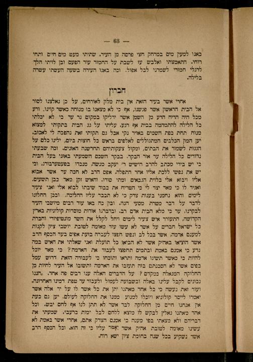 אחרי אשר בעיר הזאת אין בית מלון לאורחים, על כן נאלצנו לסור אל הבית הראשון אשר פגשנו, אף כי לא מצאנו בו מנוחה כאשר קוינו.. ורע מכל היה הריח הרע מן השמן אשר לקו במקום נר עד בי לא יכלתי כל הלילה להתמהמה בבית אף רגע. עליתי על גג הבית בתקותי למצוא מנוח תחת כפת השמים באויר נקי אבל גם תקותי זאת נהפכה לי לאכזב. יען המון הכלבים המתגוללים לאלפים בראש כל חוצות ביום, ילינו כלם על הגגות לשמור את הבתים, ומקול צעקותיהם תחרשנה האזנים. וכה שבעתי נדורים כל הלילה ער אור הבקר. בבקר השכם השמעתי באזני בעל הבית כי יש בירי מכתב להרב הישיש ר' יעקב מנשה, מנכדו בפעטערבורג, ובי יש את נפשי ללכת אליו אחר התפלה. אפס הרב לא חכה עד אשר אבוא אליו ויבוא אלי בלוית הגבאים ומתי סודו. והאיש זקן מאד כבן תשעים. ואניד לו כי מאד יצר לי כי הטריח את בבוד שיבתו לבוא אלי ואני. צעיר לימים והוא נחמני בענות צדק כי לא תכבד עליו ההליכה. ובכן החלונו לרבר על דבר מטרת מסעי הנה. ובין כה באו עוד רבים מיושבי העיר לבקרנו, ער כי מלא הבית אדם רב. ו אודות מוסדות קולוניות בארץ הקדושה, התעורר איש צעיר לימים ויחל לקלל את השר מונמיפיורי. וחברת כל ישראל חברים על אשר לא עשו עוד מאומה לטובת יושבי ציון לקנות למענם אדמה, אשר בבל לב ונפש חפצו לעברה בזעת אפים בער הכסף הרב אשר הוציאו באה'ק אשר לא הביאו כל תועלת ואני שאלתי את האיש במה נדע כי אמנם באמת ובתמים החפצו לעבור את האדמה? כי מאדר יוכל להיות כי כאשר תשיגו אדמה ותראו ותוכחו כי לעבורה הזאת דרוש עמל כפים אשר לא הסכנתם בזה תעזבו את האדמה ותשובו אל העיר לחיות כן החלוקה המגאלה כמקרם? על הדברים האלה ענו רבים פה אחר. ,הננו נכונים לקבל עלינו באלה ובשבועה לעמול ולעבור עד טפת דמינו האחרונה, ועור זאת נעשה בי כל אחר מאתנו יתן את כל אשר לו על יר אלה אשר יאמרו לייסר קולוניא ויוכלו למנוע ממנו את החלוקה לעולם. יען גם כעת אין אנחנו חיים 2 החלוקה לבד אשר לא תתן לנו אף לחם יבש. וכל אהר מאתנו נאלץ לבקש לו מוצא ללחם לבל ימות ברעב". שמעתי את דבריהם ולא מצאתי בפי מענה בי אמנם הצרק אתם, אחרי אשר באמת לא עשינו מאומה לטובת אה'ק אשר יאר עליו כי זה הוא. וכל הכסף הרב אשר נשקיע בכל שנה בחוכת ציון ישא רוח,
