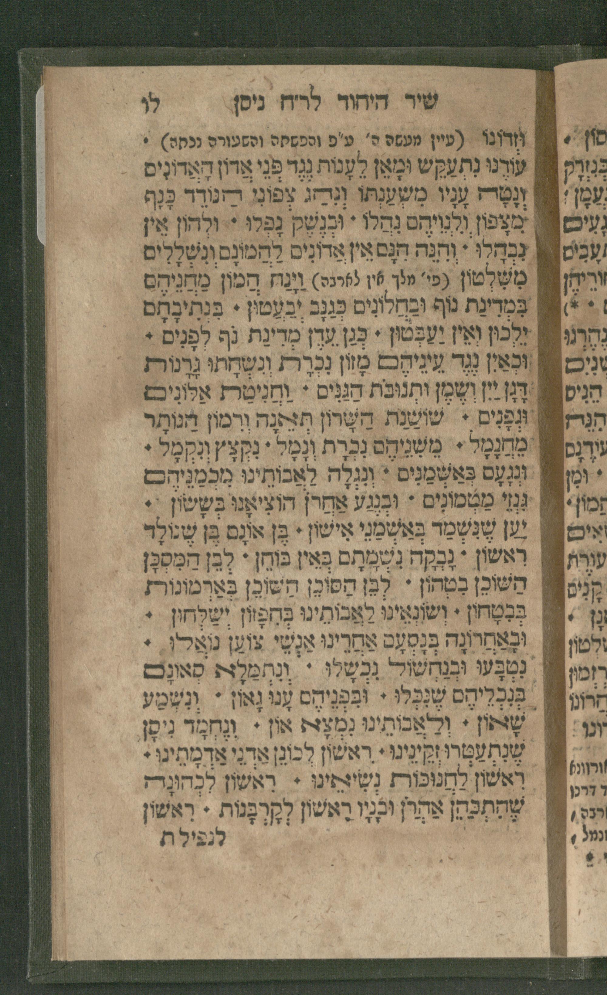 סון• וזדונו( עיין מעשה ה' ע"פ וספסקס וספעולס נכקס) בְּמִזְרָק עוֹדֵנוּ נִתְעַקֵּשׁ וּמָאֵן לַעֲנוֹת נֶגֶד פְּנֵי אֲרוֹן הָאֲדוֹנִים עֲמָן: וְנָטָה עָנָיו מִשְׁעַנְתּוֹ וְנָחַג צְפוֹנִי נוֹדֵד כָּנָף עִים מְצָפוֹן וְלִנְוֵיהֶם נַחֲלוֹ וּבְנֶשֶׁק נָפְלוּ• וּלְהוֹן אֵין עָבִים נִבְהָלוּ וְהִנֵּה הִנָּם אֵין אֲדוֹנִים לַהֲמוֹנָם וְנִשְׁלָלִים ורֵיהֶן מִשְׁלְטוֹן( פי' מלך 6 ין ל 6 רנס) וַיָּנָה הֲמוֹן מַחֲנֵיהֶם במדינת נוֹף וּבַחֲלוֹנִים כְּגַנָּב יְבַעֲטוּן• בִּנְתִיבָתָם הרְגוּ יֵלְכוּן וְאֵין יַעַבְּטוּן• כְּגַן עֵדֶן מְדִינַת כֹּף לְפָנִים• וּכְאַיִן נֶגֶד עֵינֵיהֶם מָזוֹן נִכְרָת וְנִשְׁחָתוּ גְרָנוֹת הֲנִים דָּגָן יַיִן וְשֶׁמֶן וּתְנוּבּת הַגִּנִּים וַחֲנִיטַת אַלוֹנִים וּנְפָנִים• שׁוֹשַׁנַת הַשָּׁרוֹן תְּאֵנָה וְרִמוֹן הַנוֹתָר מחנמל: מִשְׁנֵיהֶם נִבְרָת וְנָמָל נִקְצָץ וְנִקְמָל • וּמִן וּנְגְעָם בְּאַשְׁמַנִים וְנִגְלָה לַאֲבוֹתֵינוּ מִכְמַנֵיהֶם גִּנְזֵי מַטְמוֹנִים• וּבְנֶגַע אַחֲרן הוֹצִיאָנוּ בְּשָׂשׂוֹן יעַן שֶׁנִּשְׁמַד בְּאַשְׁמַנִי אִישׁוֹן בֶּן אוֹנָם בֶּן שֶׁנוֹלָד רִאשׁוֹן נָבְקָה נִשְׁמָתָם בְּאֵין בּוֹחֵן לְבֵן הַמִּסְכָּן הַשׁוֹכֵן בִטְהוֹן: לְבֵן הַפּוֹכֵן הַשׁוֹכֵן בְּאַרְמוֹנוֹת בְּבָטָחוֹן• וְשׂוֹנְאֵינוּ לַאֲבוֹתֵינוּ בְּחִפָּזוֹן יְשַׁלְחוּן וּבָאַחֲרוֹנָה בְּנָסְעָם אַחֲרֵינוּ אַנְשֵׁי צוֹעַן נוֹאֲלוּ נִטְבָּעוּ וּבְנַחְשׁוֹל נִכְשָׁלוּ: וְנִתְמַלָא סְאוֹנָם בְּנִכְלֵיהֶם שֶׁנִּכְלוּ- וּבִּפְנֵיהֶם עָנוּ גָאוֹן: וְנִשְׁמַע שָׁאוֹן• וְלַאֲבוֹתֵינוּ נִמְצָא אוֹן• וְנֶחְמָד נִיסָן שֶׁנִתְעַטְרוּ זְקֵינֵינוּ רִאשׁוֹן לְכוֹנֵן אַדְנֵי אַדְמָתֵינוּ•