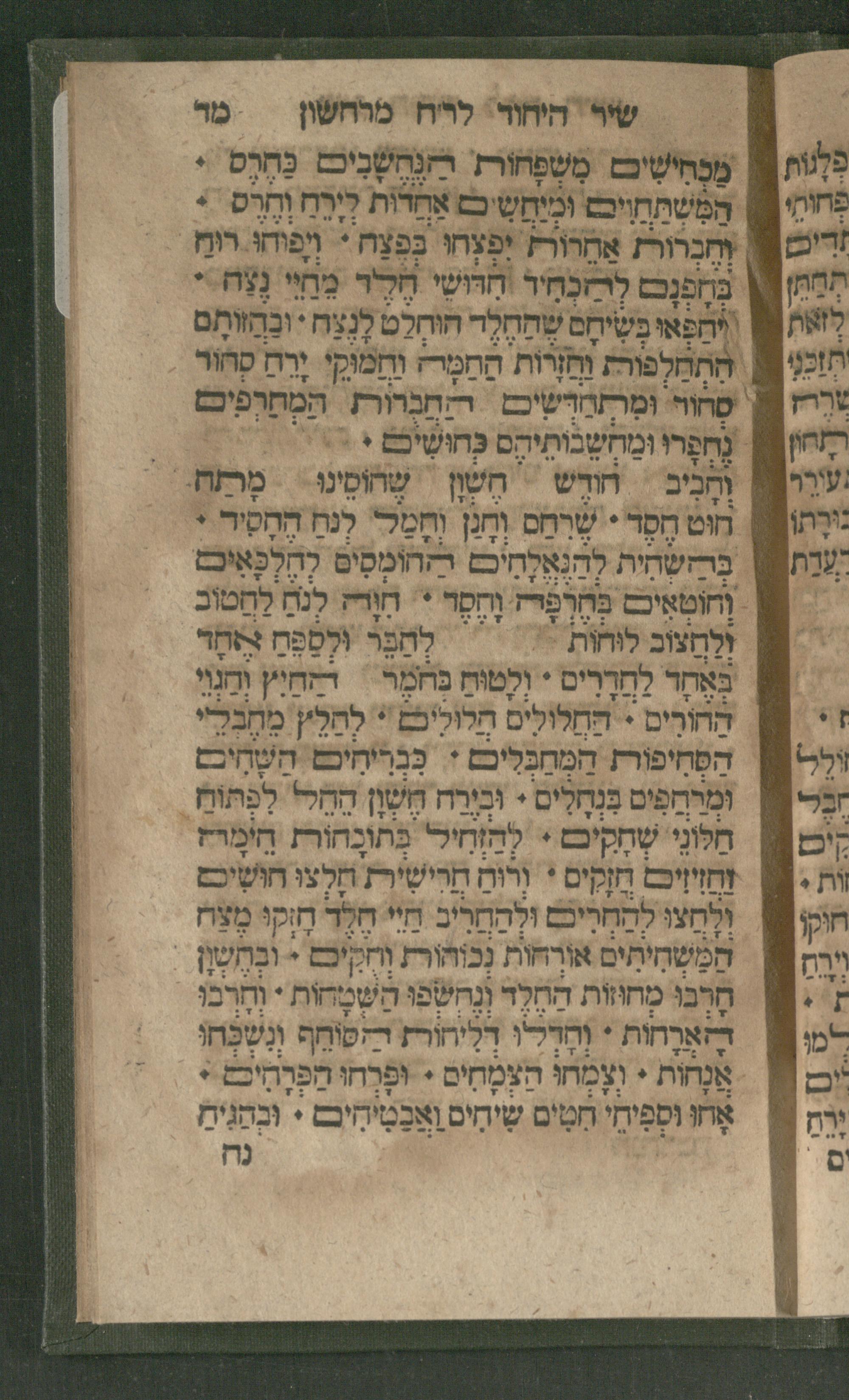 חוּט חֶסֶד שֶׁרַחַם וְחָנָן וְחָמַל לְנֹחַ הֶחָסִיד בְּהַשְׁחִית לְהַנֶּאֱלָחִים הַחוֹמְסִים לְחֶלְכָּאִים וְחוֹטְאִים בְּחֶרְפָּה וָחֶסֶר חִיָּה לְנֹחַ לַחֲטוֹב וְלַחֲצוֹב לוחות לְחַבֵּר וּלְסַפֶּחַ אֶחָד בְּאֶחָד לַחֲדָרִים וְלָטוּחַ בְּחמֶר הַחַיִץ וְהַגְוִי הַחוֹרִים• הַחֲלוּלִים חֲלוּלִים לְהַלֵץ מֵחֶבְלֵי הַסְחִיפוֹת הַמְחַבְּלִים: כִּבְרִיחִים הַשָּׁחִים וּמְרַחֲפִים בִּנְחָלִים• וּבְיֶרַח חֶשְׁנָן הֵחֵל לִפְתּוֹחַ חַלּוֹנִי שְׁחָקִים: לְהַזְחִיל בְּתוֹכָחוֹת הֵימָה ות• וַחֲזִיזִים חֲזָקִים וְרוּחַ חֲרִישִׁית חָלְצוּ חוּשִׁים וְלָחֲצוּ לְהַחְרִים וּלְהַחֲרִיב חַיֵי חֶלֶד חָזְקוּ מֵצַח הַמַּשְׁחִיתִים אוֹרְחוֹת נְכוֹחוֹת וְחָקִים• וּבְחֶשְׁנָן חָרְבוּ מְחוּזוֹת הַחֶלֶד וְנֶחְשְׁפוּ הַשְׁטָחוֹת וְחָרְבוּ האָרְחוֹת וְחָדְלוּ דְלִיחוֹת סוֹחֵף וְנִשְׁכְּחוּ אֲנָחוֹת• וְצָמְחוּ הַצְמָחִים• וּפָרְחוּ הַפְּרָחִים אָחוּ וּסְפִיחִי חֲטִים שִׁיחִים וַאֲנָטִיחִים• וּבְהַגִיחַ
