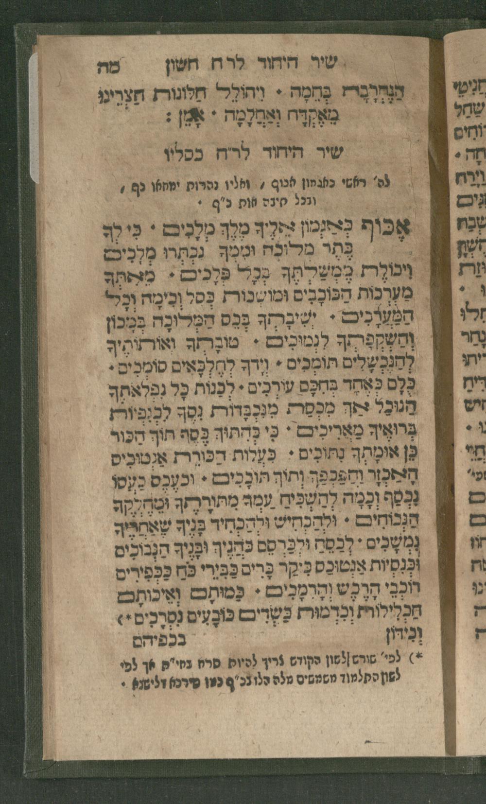 אֶכּוֹף בְּאַגְמוֹן אֵלֶיךָ מֶלֶךְ מְלָכִים כִּי לְךָ כֶּתֶר מלוכה וּמִמְךְ נִכְתְּרוּ מְלָכִים נִיכוֹלֶת מֶמְשַׁלְתֶּךָ בְּכָל פְּלָנִים מֵאִתְּךָ מַעַרְכוֹת הַכּוֹכָבִים וּמוֹשְׁנוֹת כְּסֶל וְכִימָה וְכָל הַמַּעֲרָבִים יְשִׁיבָתְךָ בְּנֵס הַמְּלוּכָה בְּכָכוֹן וְהַשְׁקְפָתְךָ לִנְמוּכִים• טוֹבָתְךָ וְאוֹתוֹתֶיךָ לְהַנִּבְשָׁלִים תּוֹמְרִים- וְיָדְךָ לְחֶלְכָּאִים סוֹמְכִים כּלָם כְּאֶחָד בְּחִבָּם עוֹרְכִים לְכָנוֹת כָּל נִפְלְאֹתְךָ הנוּכַל אַךְ מִכְסַת מַנִּכְבָּדוֹת נְסֶךְ לִכְנִפְיוֹת בְּרוּאֵיךְ מַאֲרִיכִים כִּי כְּהִתּוּךְ כָּסֶף תּוֹךְ הַכּור בֶּן אוּמָתְךָ וַתּוֹכִים: בַּעֲלוֹת הַכּוֹרֶת אַנְטוּבִים הָאַכְזָר וְהַמַּכְפַּךְ וְתוֹךְ תּוֹכָבִים• וכעֶכֶס כעסו נִכְסֵף וְכָמָה לְהַשְׁכִּיחַ עַמְךְ מִתּוֹרָתֶךָ וּמֵחֶלְקְךָ הַנְבוֹחִים• וּלְהַכְחִישׁ וּלְהַכְחִיד בָּנֶיךָ שֶׁאַחֲרֶיךָ נִמְשָׁכִים לְכַסֶה וּלְפַרְסֵם כֹּהֲנֶיךְ וּבָּנֶיךָ הַגְּבוֹכִים וּכְּנָסִיוֹת אַנְטוּנָס כִּיקַר כָּרִים כַּבִּירִי כֹּחַ כַּכְּפִירִים רוֹכְבֵי הָרֶכֶשׁ וְהָרְמָבִים: כָּמוּתָם וְאֵיכוּתָם חַכְלִילוֹת וְכַדְמוּת כַּשְׂרִים כּוֹבָעִים נִסְרָכִים*)