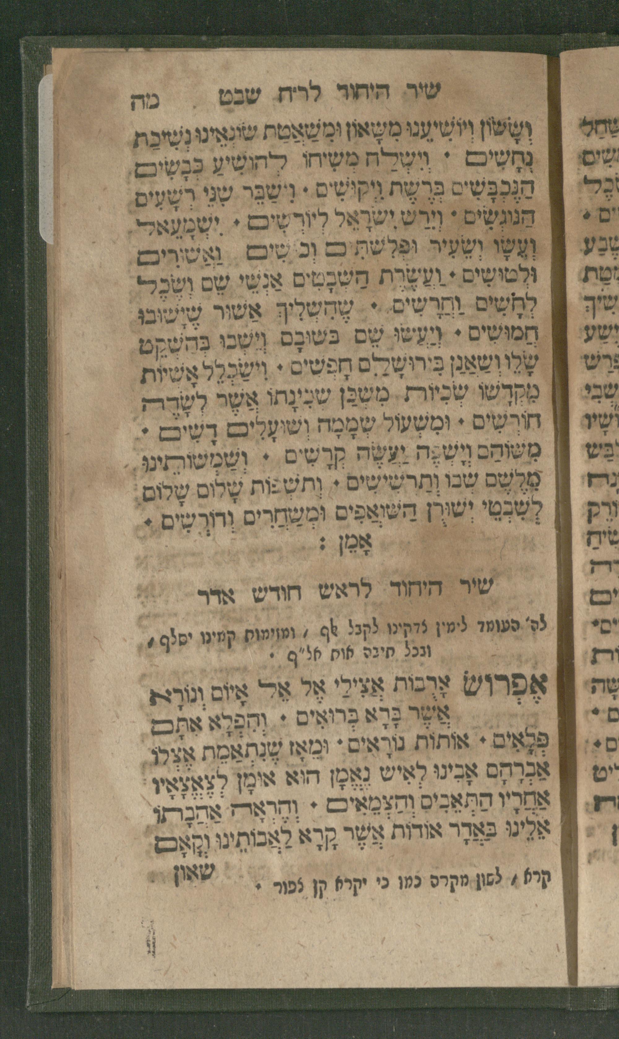 שיר היחוד לריח שבט וְשָׂשׂוֹן וְיוֹשִׁיעֵנוּ מִשָּׁאוֹן וּמִשַׁאֲטַת שׂוֹנְאֵינוּ נְשִׁיכת נְחָשִׁים: וְיִשְׁלַח מִשִׁיחוֹ לְהוֹשִׁיעַ כְּבָשִׂיםם הַנָּכְבָּשִׁים בִּרְשֶׁת וַיְקוּשִׁים וִישַׁבֵּר שְׁנֵי רְשָׁעִים הנוגשים• וְיִרַשׁ יִשְׂרָאֵל לִיוֹרְשִׁים יִשְׁמָעֵאל וְעֶשָׂו וְשָׂעִיר וּפְלִשְׁתִּים וְלשִׁים וַאשרים וּלְטוּשִׁים וַעֲשֶׂרֶת הַשְׁבָטִים אַנְשֵׁי שֵׁם וְשֶׂבֶל להָשִׁים וַחֲרָשִׁים• שֶׁהִשְׁלִיךְ אַשׁוּר שֶׁיָּשׁוּבוּ חמוּשִׁים: וְיַעֲשׁוּ שֵׁם בְּשׁוּבָם וְיִשְׁבוּ בְּהַשְׁקֶט שלו ושאֲנָן בִּירוּשָׁלַם חָפְשִׁים• וישכלל אשיות מקְדֶשׁוֹ שְׂכִיוֹת מִשְׁכָּן שְׁנִינָתוֹ אֲשֶׁר לְשָׂדֶה חורשים• וּמִשְׁעוֹל שְׁמָמָה וְשׁוּעָלִים דָשִׁים משׁוֹהַם וְיָשְׁנֶה יַעֲשֶׂה קְרָשִׁים: וְשַׁמְשׁוֹתֵינוּ מלשם שבו וְתַרְשִׁישִׁים: וְתִשְׁפוֹת שָׁלוֹם שָׁלוֹם לְשִׁבְטֵי יְשׁוּרֶן הַשׁוֹאֲפִים וּמְשַׁחֲרִים וְדוֹרְשִׁים אָמֵן: