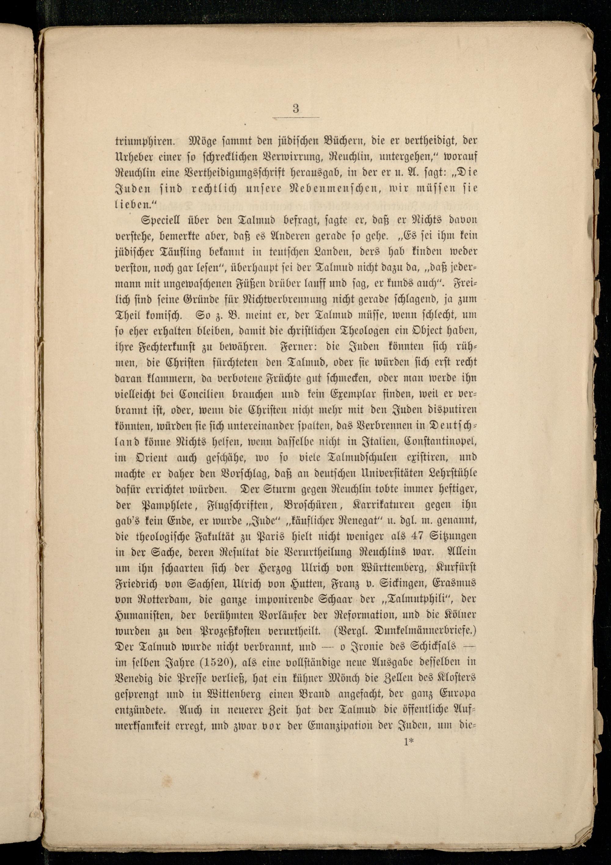 3 triumphiren. Möge ſammt den jüdiſchen Büchern, die er vertheidigt, der Urheber einer ſo ſchrecklichen Verwirrung, Reuchlin, untergehen,“ worauf Reuchlin eine Vertheidigungsſchrift herausgab, in der er u. A. ſagt:„Die Juden ſind rechtlich unſere Nebenmenſchen, wir müſſen ſie lieben.“