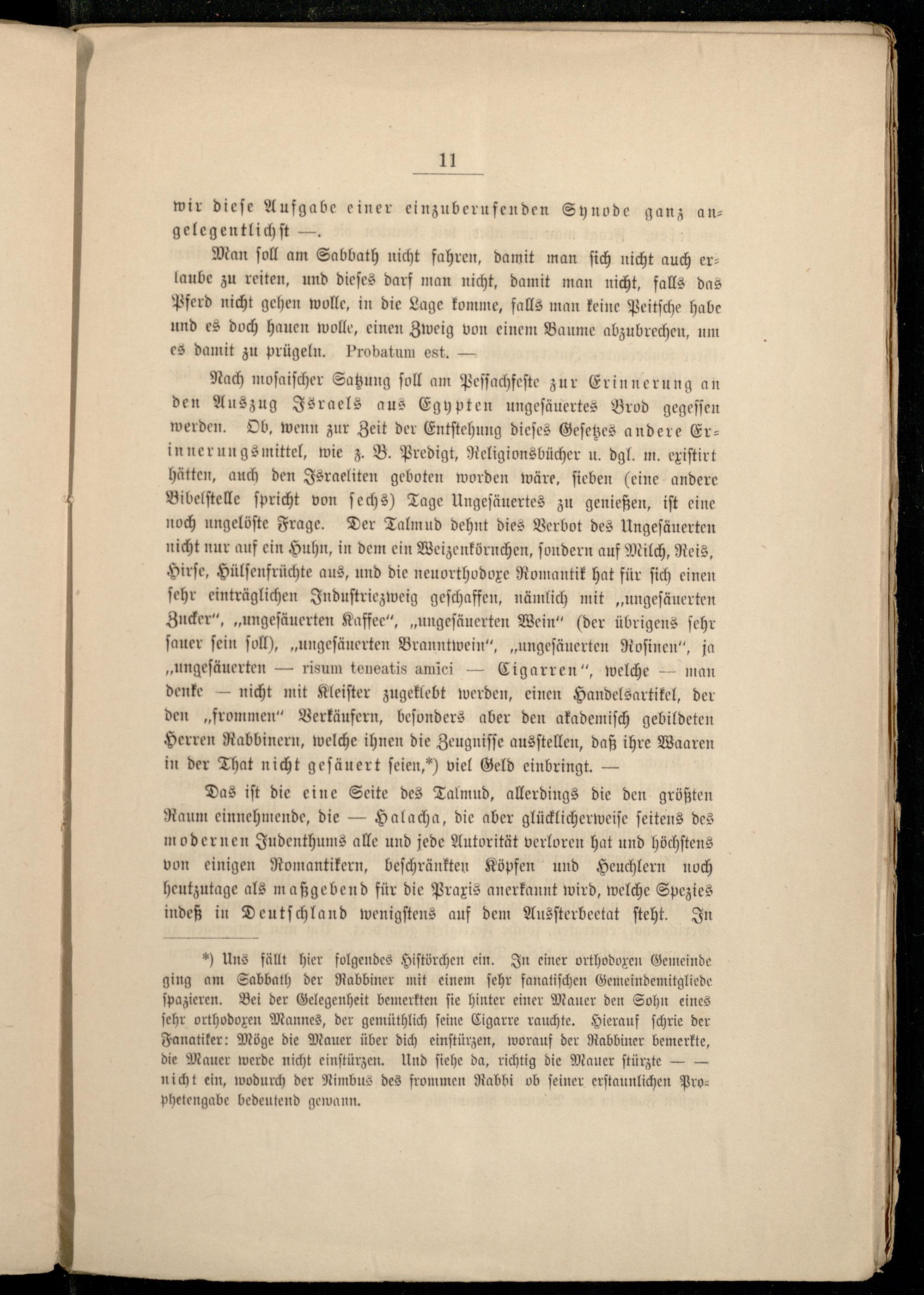 Man ſoll am Sabbath nicht fahren, damit man ſich nicht auch erlaube zu reiten, und dieſes darf man nicht, damit man nicht, falls das Pferd nicht gehen wolle, in die Lage komme, falls man keine Peitſche habe und es doch hauen wolle, einen Zweig von einem Baume abzubrechen, um es damit zu prügeln. Probatum est.—