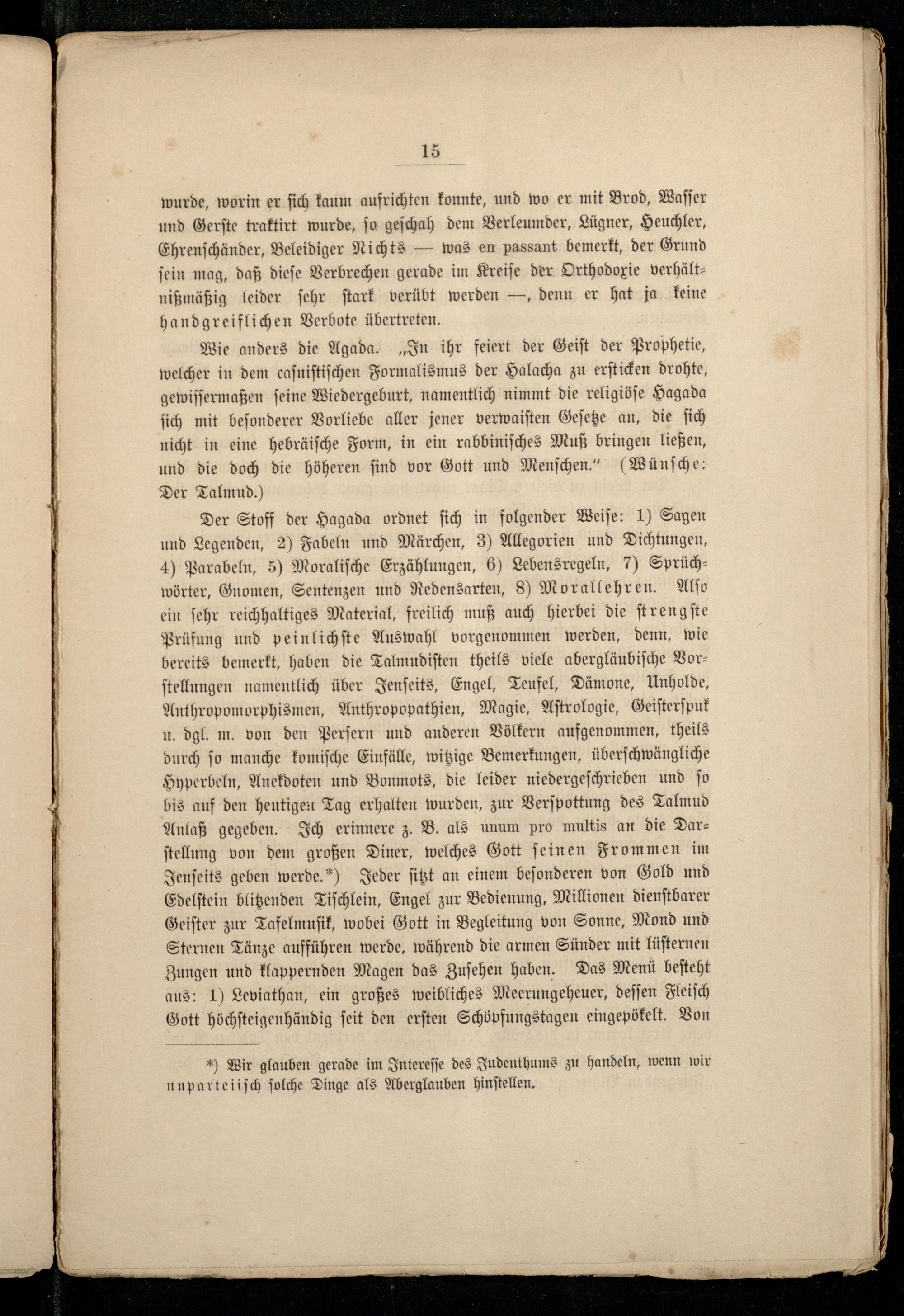 Der Stoff der Hagada ordnet ſich in folgender Weiſe: 1) Sagen und Legenden, 2) Fabeln und Märchen, 3) Allegorien und Dichtungen, 4) Parabeln, 5) Moraliſche Erzählungen, 6) Lebensregeln, 7) Sprüchwörter, Gnomen, Sentenzen und Redensarten, 8) Morallehren. Alſo ein ſehr reichhaltiges Material, freilich muß auch hierbei die ſtreng ſte Prüfung und peinlichſte Auswahl vorgenommen werden, denn, wie bereits bemerkt, haben die Talmudiſten theils viele abergläubiſche Vor— ſtellungen namentlich über Jenſeits, Engel, Teufel, Dämone, Unholde, Anthropomorphismen, Anthropopathien, Magie, Aſtrologie, Geiſterſpuk u. dgl. m. von den Perſern und anderen Völkern aufgenommen, theils durch ſo manche komiſche Einfälle, witzige Bemerkungen, überſchwängliche Hyperbeln, Anekdoten und Bonmots, die leider niedergeſchrieben und ſo bis auf den heutigen Tag erhalten wurden, zur Verſpottung des Talmud Anlaß gegeben. Ich erinnere z. B. als unum pro multis an die Darſtellung von dem großen Diner, welches Gott ſeinen Frommen im Jenſeits geben werde.“ Jeder ſitzt an einem beſonderen von Gold und Edelſtein blitzenden Tiſchlein, Engel zur Bedienung, Millionen dienſtbarer Geiſter zur Tafelmuſik, wobei Gott in Begleitung von Sonne, Mond und Sternen Tänze aufführen werde, während die armen Sünder mit lüſternen Zungen und klappernden Magen das Zuſehen haben. Das Menü beſteht aus: 1) Leviathan , ein großes weibliches Meerungeheuer, deſſen Fleiſch Gott höchſteigenhändig ſeit den erſten Schöpfungstagen eingepökelt. Von