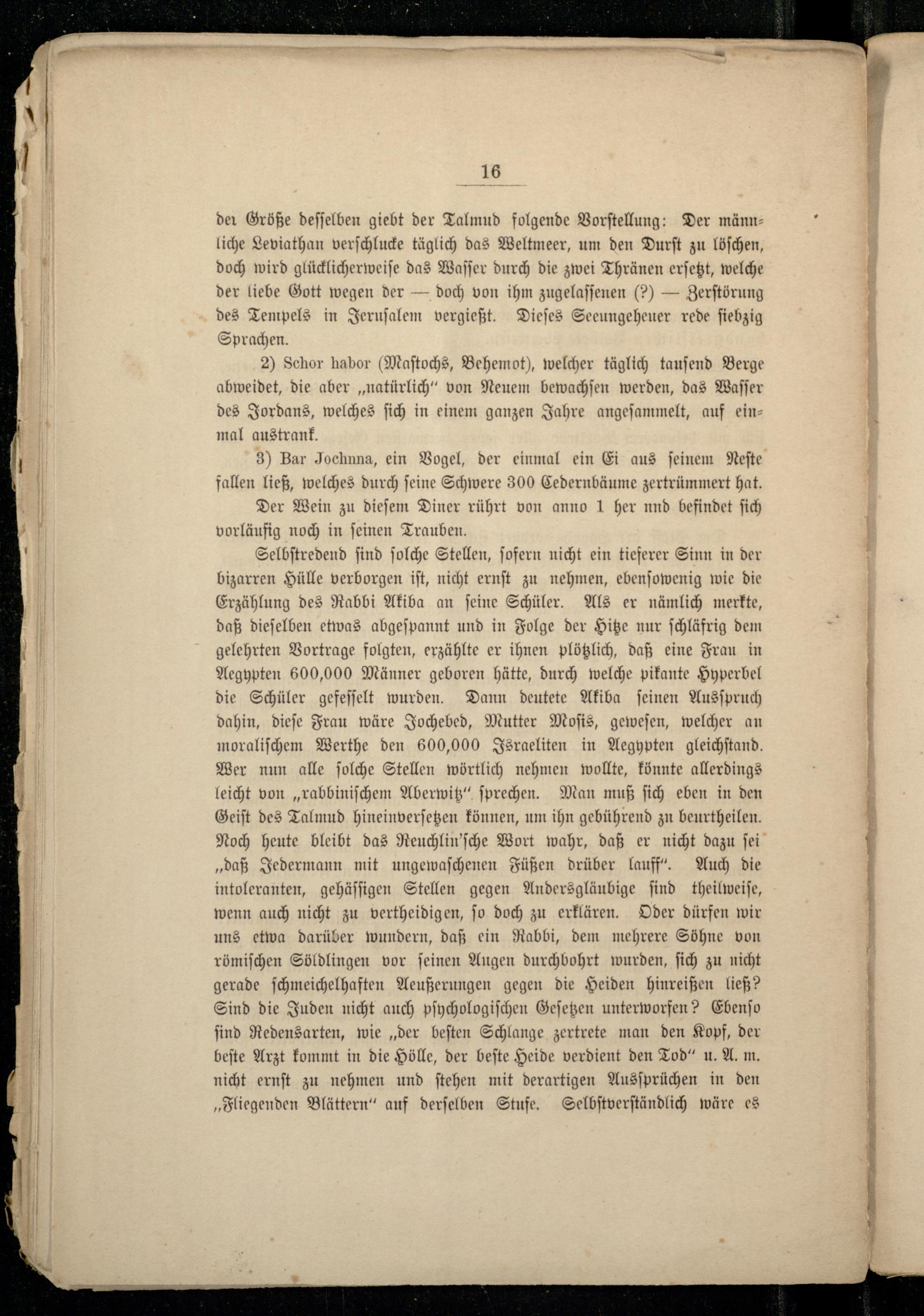 Selbſtredend ſind ſolche Stellen, ſofern nicht ein tieferer Sinn in der bizarren Hülle verborgen iſt, nicht ernſt zu nehmen, ebenſowenig wie die Erzählung des Rabbi Akiba an ſeine Schüler. Als er nämlich merkte, daß dieſelben etwas abgeſpannt und in Folge der Hitze nur ſchläfrig dem gelehrten Vortrage folgten, erzählte er ihnen plötzlich, daß eine Frau in Aegypten 600,000 Männer geboren hätte, durch welche pikante Hyperbel die Schüler gefeſſelt wurden. Dann deutete Akiba ſeinen Ausſpruch dahin, dieſe Frau wäre Jochebed , Mutter Moſis, geweſen, welcher an moraliſchem Werthe den 600,000 Israeliten in Aegypten gleichſtand. Wer nun alle ſolche Stellen wörtlich nehmen wollte, könnte allerdings leicht von„rabbiniſchem Aberwitz“ ſprechen. Man muß ſich eben in den Geiſt des Talmud hineinverſetzen können, um ihn gebührend zn beurtheilen. Noch heute bleibt das Reuchlin'ſche Wort wahr, daß er nicht dazu ſei „daß Jedermann mit ungewaſchenen Füßen drüber lauff“. Auch die intoleranten, gehäſſigen Stellen gegen Andersgläubige ſind theilweiſe, wenn auch nicht zu vertheidigen, ſo doch zu erklären. Oder dürfen wir uns etwa darüber wundern, daß ein Rabbi, dem mehrere Söhne von römiſchen Söldlingen vor ſeinen Augen durchbohrt wurden, ſich zu nicht gerade ſchmeichelhaften Aeußerungen gegen die Heiden hinreißen ließ? Sind die Juden nicht auch pſychologiſchen Geſetzen unterworfen? Ebenſo ſind Redensarten, wie„der beſten Schlange zertrete man den Kopf, der beſte Arzt kommt in die Hölle, der beſte Heide verdient den Tod“ u. A. m. nicht ernſt zu nehmen und ſtehen mit derartigen Ausſprüchen in den „Fliegenden Blättern “ auf derſelben Stufe. Selbſtverſtändlich wäre es