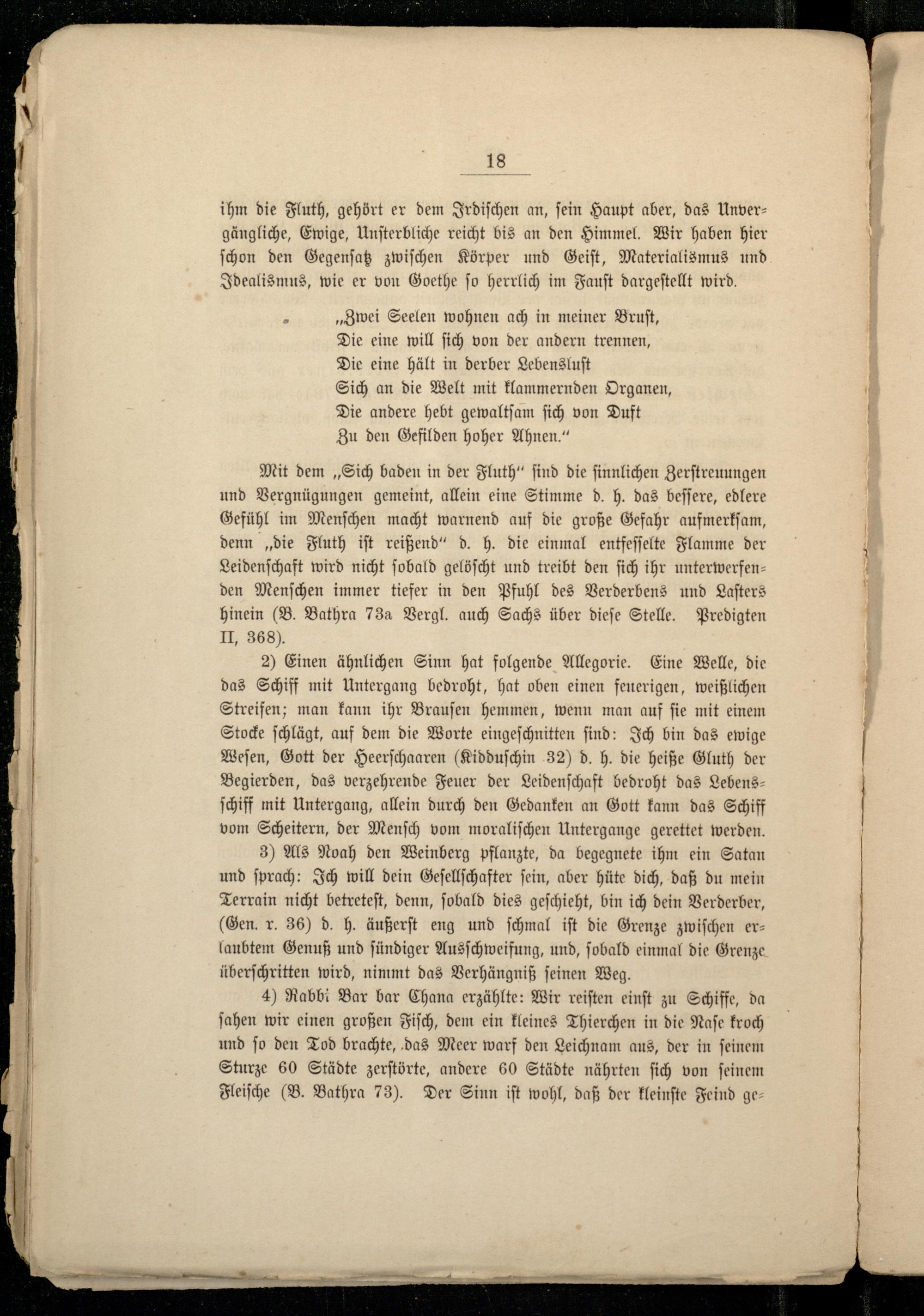 | — 18| A| ihm die Fluth, gehört er dem Irdiſchen an, fein Haupt aber, das Unver⸗| gängliche, Ewige, Unſterbliche reicht bis an den Himmel. Wir haben hier\ ſchon den Gegenſatz zwiſchen Körper und Geiſt, Materialismus und Idealismus, wie er von Goethe ſo herrlich im Fauſt dargeſtellt wird. „Zwei Seelen wohnen ach in meiner Bruſt, Die eine will ſich von der andern trennen, Die eine hält in derber Lebensluſt Sich an die Welt mit klammernden Organen, ö Die andere hebt gewaltſam ſich von Duft| Zu den Gefilden hoher Ahnen.“ | Mit dem„Sich baden in der Fluth“ find die ſinnlichen Zerſtreuungen und Vergnügungen gemeint, allein eine Stimme d. h. das beſſere, edlere Gefühl im Menſchen macht warnend auf die große Gefahr aufmerkſam, | denn„die Fluth iſt reißend“ d. h. die einmal entfeſſelte Flamme der