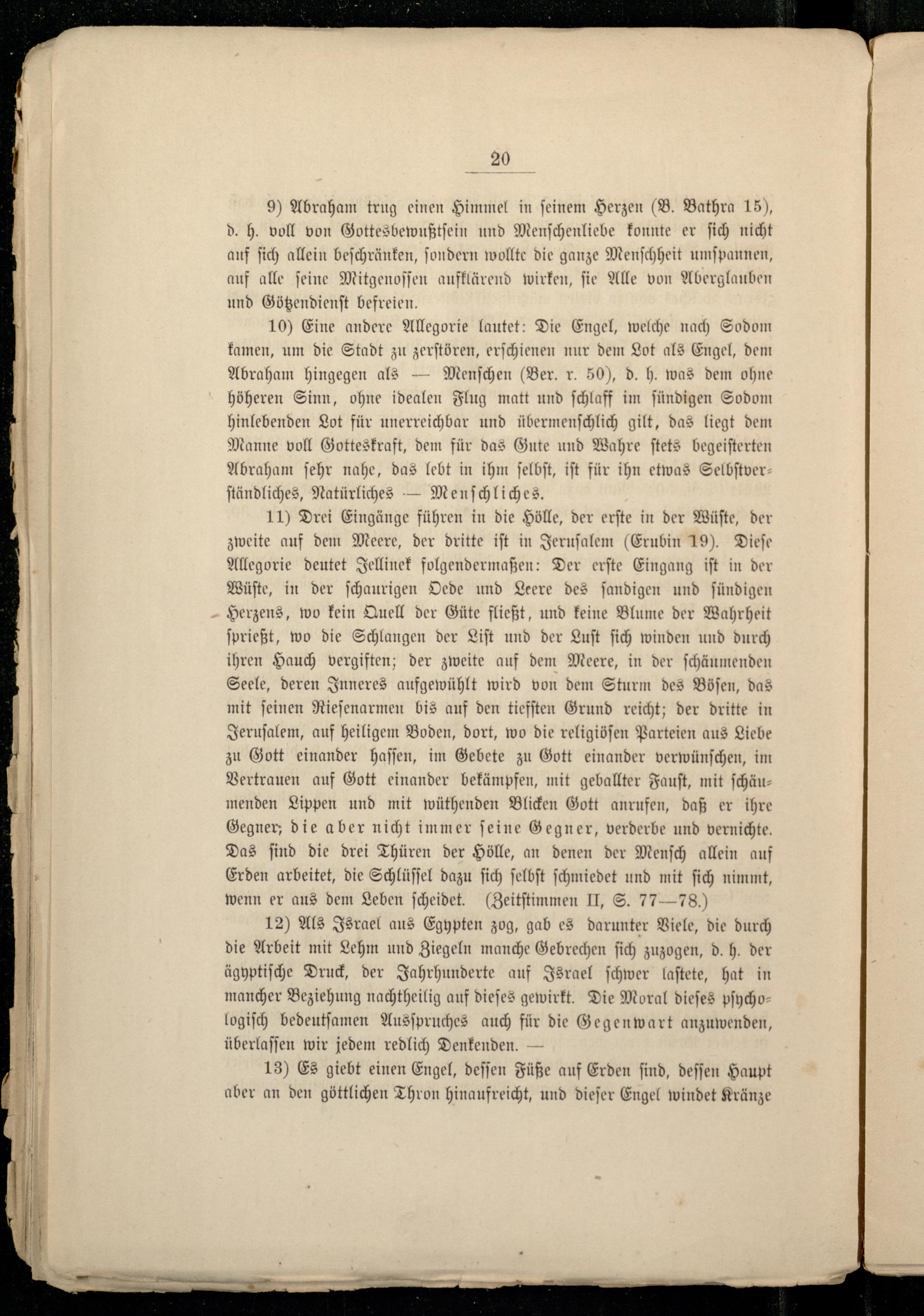 11) Drei Eingänge führen in die Hölle, der erſte in der Wüſte, der zweite auf dem Meere, der dritte iſt in Jeruſalem (Erubin 19). Dieſe Allegorie deutet Jellinek folgendermaßen: Der erſte Eingang iſt in der Wüſte, in der ſchaurigen Oede und Leere des ſandigen und ſündigen Herzens, wo kein Quell der Güte fließt, und keine Blume der Wahrheit ſprießt, wo die Schlangen der Liſt und der Luſt ſich winden und durch ihren Hauch vergiften; der zweite auf dem Meere, in der ſchäumenden Seele, deren Inneres aufgewühlt wird von dem Sturm des Böſen, das mit ſeinen Rieſenarmen bis auf den tiefſten Grund reicht; der dritte in Jeruſalem , auf heiligem Boden, dort, wo die religiöſen Parteien aus Liebe zu Gott einander haſſen, im Gebete zu Gott einander verwünſchen, im Vertrauen auf Gott einander bekämpfen, mit geballter Fauſt, mit ſchäu—menden Lippen und mit wüthenden Blicken Gott anrufen, daß er ihre Gegner; die aber nicht immer ſeine Gegner, verderbe und vernichte. Das ſind die drei Thüren der Hölle, an denen der Menſch allein auf Erden arbeitet, die Schlüſſel dazu ſich ſelbſt ſchmiedet und mit ſich nimmt, wenn er aus dem Leben ſcheidet.(Zeitſtimmen II, S. 77-78.)