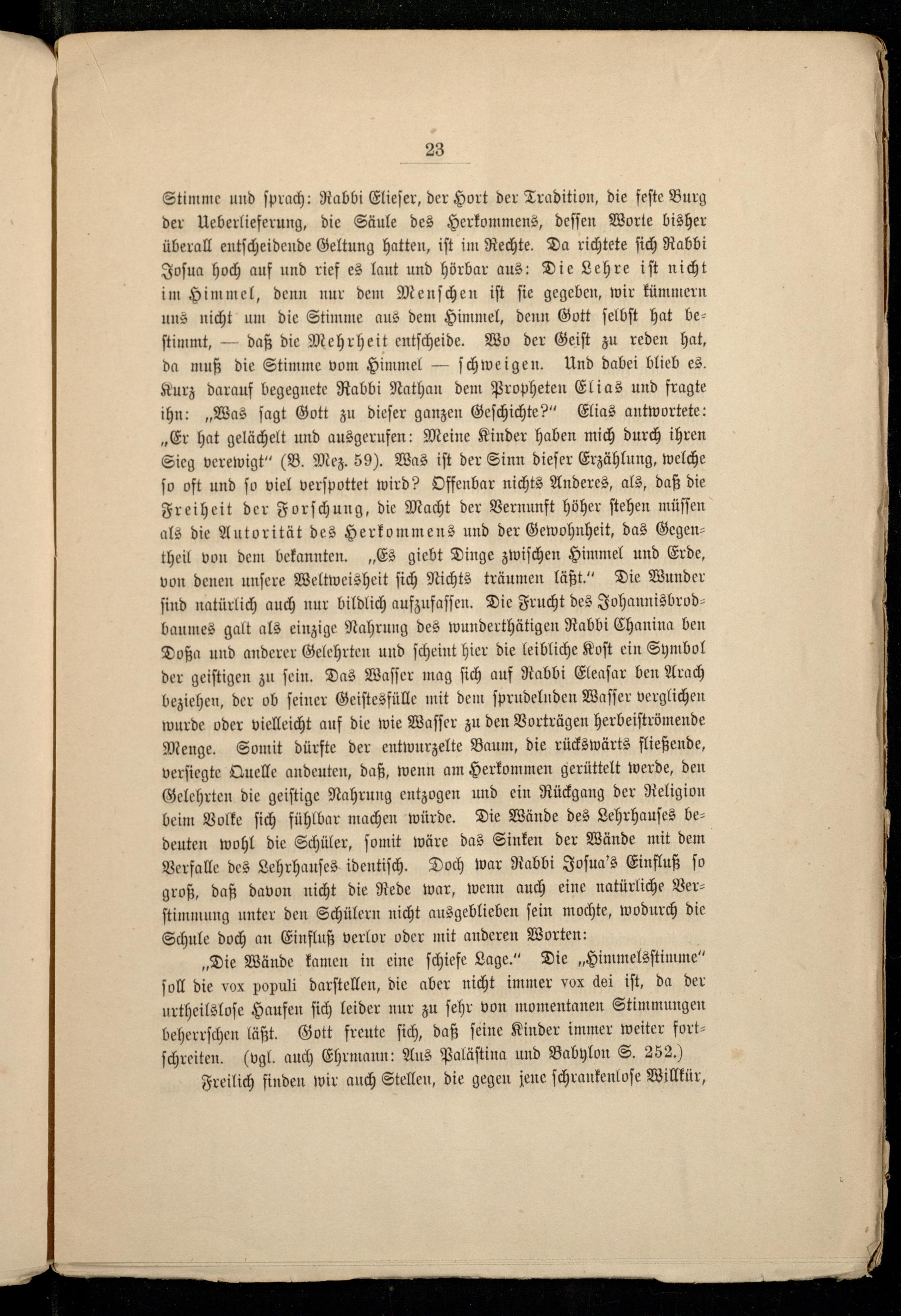 Stimme und ſprach: Rabbi Elieſer, der Hort der Tradition, die feſte Burg der Ueberlieferung, die Säule des Herkommens, deſſen Worte bisher überall entſcheidende Geltung hatten, iſt im Rechte. Da richtete ſich Rabbi Joſua hoch auf und rief es laut und hörbar aus: Die Lehre iſt nicht im Himmel, denn nur dem Menſchen iſt ſie gegeben, wir kümmern uns nicht um die Stimme aus dem Himmel, denn Gott ſelbſt hat beſtimmt,— daß die Mehrheit entſcheide. Wo der Geiſt zu reden hat, da muß die Stimme vom Himmel— ſchweigen. Und dabei blieb es. Kurz darauf begegnete Rabbi Nathan dem Propheten Elias und fragte ihn:„Was ſagt Gott zu dieſer ganzen Geſchichte“! Elias antwortete: Er hat gelächelt und ausgerufen: Meine Kinder haben mich durch ihren Sieg verewigt“(B. Mez. 59). Was iſt der Sinn dieſer Erzählung, welche ſo oft und ſo viel verſpottet wird? Offenbar nichts Anderes, als, daß die Freiheit der Forſchung, die Macht der Vernunft höher ſtehen müſſen als die Autorität des Herkomm ens und der Gewohnheit, das Gegen— theil von dem bekannten.„Es giebt Dinge zwiſchen Himmel und Erde, von denen unſere Weltweisheit ſich Nichts träumen läßt.“ Die Wunder find natürlich auch nur bildlich aufzufaſſen. Die Frucht des Johannisbrodbaumes galt als einzige Nahrung des wunderthätigen Rabbi Chanina ben Doßa und anderer Gelehrten und ſcheint hier die leibliche Koſt ein Symbol der geiſtigen zu ſein. Das Waſſer mag ſich auf Rabbi Eleaſar ben Arach beziehen, der ob ſeiner Geiſtesfülle mit dem ſprudelnden Waſſer verglichen wurde oder vielleicht auf die wie Waſſer zu den Vorträgen herbeiſtrömende Menge. Somit dürfte der entwurzelte Baum, die rückswärts fließende, verſiegte Quelle andeuten, daß, wenn am Herkommen gerüttelt werde, den Gelehrten die geiſtige Nahrung entzogen und ein Rückgang der Religion beim Volke ſich fühlbar machen würde. Die Wände des Lehrhauſes bedeuten wohl die Schüler, ſomit wäre das Sinken der Wände mit dem Verfalle des Lehrhauſes identiſch. Doch war Rabbi Joſua's Einfluß ſo groß, daß davon nicht die Rede war, wenn auch eine natürliche Verſtimmung unter den Schülern nicht ausgeblieben ſein mochte, wodurch die Schule doch an Einfluß verlor oder mit anderen Worten: