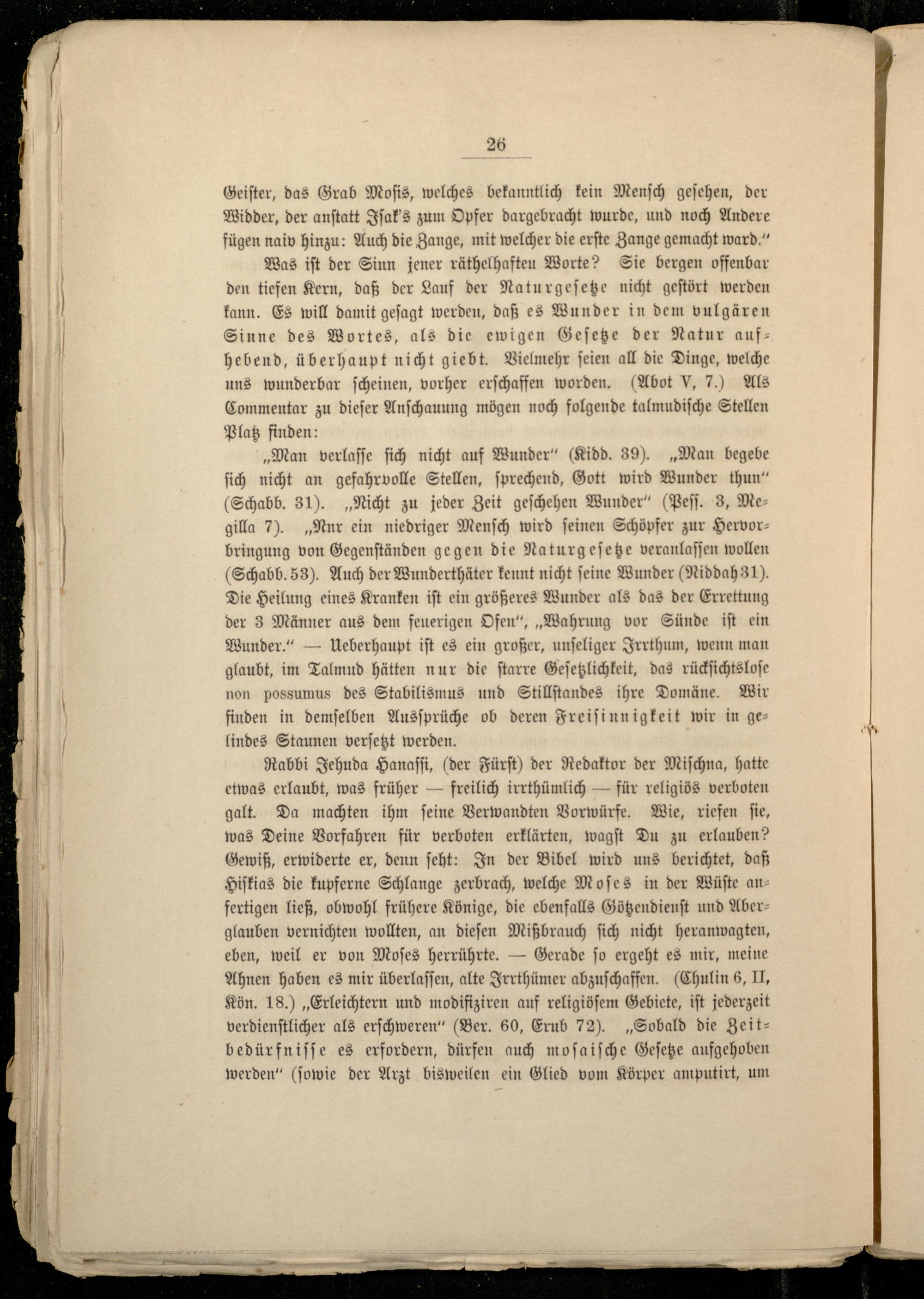 Was iſt der Sinn jener räthelhafteu Worte? Sie bergen offenbar den tiefen Kern, daß der Lauf der Naturgeſetze nicht geſtört werden kann. Es will damit geſagt werden, daß es Wunder in dem vulgären Sinne des Wortes, als die ewigen Geſetze der Natur aufhebend, überhaupt nicht giebt. Vielmehr ſeien all die Dinge, welche uns wunderbar ſcheinen, vorher erſchaffen worden.(Abot V, 7) Als Commentar zu dieſer Anſchauung mögen noch folgende talmudiſche Stellen Platz finden: