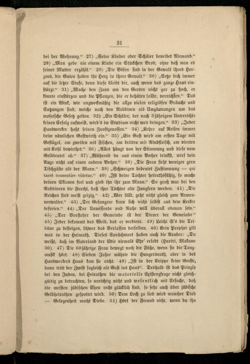 bei der Wohnung.“ 27)„Seine Kinder oder Schüler beneidet Niemand.“ 28)„Man gebe nie einem Kinde ein Stückchen Brod, ohne daß man es feiner Mutter erzählt. 29)„Die Böſen find in der Gewalt ihres Herzens, die Guten haben ihr Herz in ihrer Gewalt.“ 30)„Setze dich immer auf die letzte Stufe, denn dieſe bleibt dir, auch wenn das ganze Haus einſtürzt.“ 31)„Mache den Zaun um den Garten nicht gar zu hoch, er könnte einſtürzen und die Pflanzen, die er behüten ſollte, vernichten.“ Das iſt ein Wink, wie unzweckmäßig die allzu vielen religiöſen Bräuche und Satzungen ſind, welche nach den Rabbinen als Umzäunungen um das moſaiſche Geſetz gelten. 32)„Ein Schüler, der nach 3 jährigem Unterrichte keinen Erfolg aufweiſt, wird's im Studium nicht weit bringen.“ 33)„Jeder Handwerker haßt ſeinen Zunftgenoſſen.“ 34)„Kehre auf Reiſen immer beim nämlichen Gaſtwirth ein.“ 35)„Ein Gaſt wird am erſten Tage mit Geflügel, am zweiten mit Fiſchen, am dritten mit Rindfleiſch, am vierten mit Kohl bewirthet.“ 36)„Alles hängt von der Stimmung und dieſe vom Geldbeutel ab.“ 37)„Während du aus einem Becher trinkſt, wirf dein Auge nicht auf einen andern Becher.“ 38)„Die Frau ſieht weniger gern Tiſchgäſte als der Mann.“ 39)„Schweigen bedeutet Zuſtimmung— qui tacet consentire videtur.“ 40)„Iſt deine Tochter heirathsfähig, ſo mache deinen Sklaven frei und gieb ihn ihr zum Mann.“ So groß war bei den Rabbinern die Furcht, daß ihre Töchter alte Jungfern werden. 41)„Die Reichen find meiſt geizig.“ 42)„Wer fällt, geht nicht gleich zum Armen— verwalter.“ 43)„Der Gefangene kann ſich nicht ſelbſt aus dem Kerker befreien.“ 44)„Der Unwiſſende und Rohe will überall obenan fein.“ 45)„Der Vorſteher der Gemeinde iſt der Diener der Gemeinde“ 45) Jeder bekommt das Weib, das er verdient. 49) Leicht iſt's die Tribüne zu beſteigen, ſchwer das Verlaſſen derſelben. 46) Kein Prophet gilt was in der Heimath. Dieſes Sprüchwort haben auch die Araber:„Du weißt, daß im Vaterland der Edle niemals Ehr' erlebt(Hariri, Makame 30). 47) Die 60 jährige Frau bewegt noch die Füße, wenn ſie die Tanzmuſik hört. 48) Sieben Jahre währte die Hungersnoth, aber in des Handwerkers Haus kam ſie nicht. 49)„Iſt in der Krippe keine Gerſte, dann tritt der Zwiſt ſogleich als Gaſt ins Haus“. Deshalb iſt das Prinzip bei den Juden, bei Heirathen die materielle Exiſtenzfrage nicht gleichgültig zu betrachten, ſo unrichtig nicht und weſentlich mit Urſache, daß die meiſten jüdiſchen Ehen recht glücklich ſind, ſo ſehr auch über jüdiſche Geldheirathen geſpottet wird. 50) Dem Loch zu lieb wird mancher Dieb — Gelegenheit macht Diebe. 51) Hört der Freund nicht, wenn du ihn