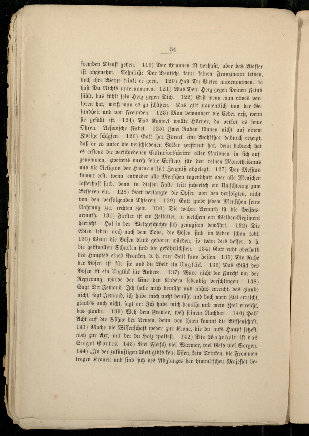 fremden Dienſt gehen. 119) Der Brunnen iſt verhaßt, aber das Waſſer iſt angenehm. Aehnlich: Der Deutſche kann keinen Franzmann leiden, doch ihre Weine trinkt er gern. 120) Haſt Du Vieles unternommen, ſo haſt Du Nichts unternommen. 121) Was Dein Herz gegen Deinen Feind fühlt, das fühlt ſein Herz gegen Dich. 122) Erſt wenn man etwas ver— loren hat, weiß man es zu ſchätzen. Das gilt namentlich von der Geſundheit und von Freunden. 123) Man bewundert die Ceder erſt, wenn ſie gefällt iſt. 124) Das Kameel wollte Hörner, da verlor es ſeine Ohren. Aeſopiſche Fabel. 125) Zwei Raben können nicht auf einem Zweige ſchlafen. 126) Gott hat Israel eine Wohlthat dadurch erzeigt, daß er es unter die verſchiedenen Völker zerſtreut hat, denn dadurch hat es erſtens die verſchiedenen Culturfortſchritte aller Nationen in ſich aufgenommen, zweitens durch ſeine Eriſtenz für den reinen Monotheismus und die Religion der Humanität Zeugniß abgelegt. 127) Der Meſſias kommt erſt, wenn entweder alle Menſchen tugendhaft oder alle Menſchen laſterhaft ſind, denn in dieſem Falle tritt ſicherlich ein Umſchwung zum Beſſeren ein. 128) Gott verlangte die Opfer von den verfolgten, nicht von den verfolgenden Thieren. 129) Gott giebt jedem Menſchen ſeine Nahrung zur rechten Zeit. 130) Die wahre Armuth iſt die Geiſtes— armuth. 131) Finſter iſt ein Zeitalter, in welchem ein Weiber⸗Regiment herrſcht. Hat in der Weltgeſchichte ſich genugſam bewährt. 132) Die Edlen leben noch nach dem Tode, die Böſen ſind im Leben ſchon todt. 133) Wenn die Böſen blind geboren würden, jo wäre dies beſſer, d. h. die geiſtvollen Schurken ſind die gefährlichſten. 134) Gott ruht oberhalb des Hauptes eines Kranken, d. h. nur Gott kann heilen. 135) Die Ruhe der Böſen iſt für ſie und die Welt ein Unglück. 136) Das Glück des Böſen iſt ein Unglück für Andere. 137) Wäre nicht die Furcht vor der Regierung, würde der Eine den Andern lebendig verſchlingen. 138) Sagt Dir Jemand: Ich habe mich bemüht und nichts erreicht, das glaube nicht, ſagt Jemand, ich habe mich nicht bemüht und doch mein Ziel erreicht, glaub's auch nicht, ſagt er: Ich habe mich bemüht und mein Ziel erreicht, das glaube. 139) Weh dem Frevler, weh ſeinem Nachbar. 140) Hab' Acht auf die Söhne der Armen, denn von ihnen kommt die Wiſſenſchaft. 141) Mache die Wiſſenſchaft weder zur Krone, die du aufs Haupt ſetzeſt, noch zur Axt, mit der du Holz ſpalteſt. 142) Die Wahrheit iſt das Siegel Gottes. 143) Viel Fleiſch viel Würmer, viel Geld viel Sorgen. 144)„In der zukünftigen Welt gibts kein Eſſen, kein Trinken, die Frommen tragen Kronen und ſind ſich des Abglanzes der himmliſchen Majeſtät be