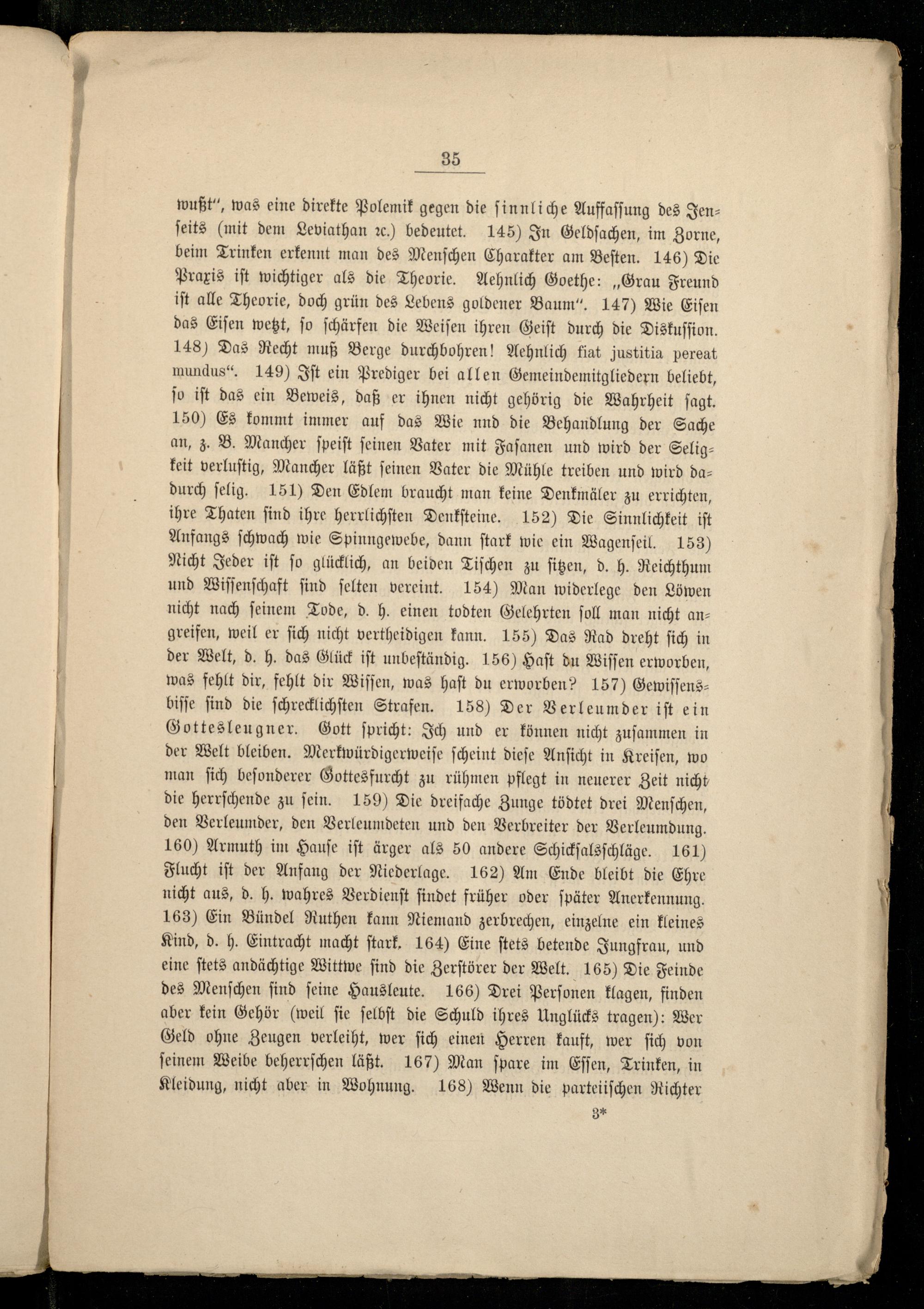 35 wußt“, was eine direkte Polemik gegen die ſinnliche Auffaſſung des Jenſeits(mit dem Leviathan 20.) bedeutet. 145) In Geldſachen, im Zorne, beim Trinken erkennt man des Menſchen Charakter am Beſten. 146) Die Praxis iſt wichtiger als die Theorie. Aehnlich Goethe:„Grau Freund iſt alle Theorie, doch grün des Lebens goldener Baum“ 147) Wie Eiſen das Eiſen wetzt, ſo ſchärfen die Weiſen ihren Geiſt durch die Diskuſſion. 148) Das Recht muß Berge durchbohren! Aehnlich fiat justitia pereat mundus“ 149) Iſt ein Prediger bei allen Gemeindemitgliedern beliebt, ſo iſt das ein Beweis, daß er ihnen nicht gehörig die Wahrheit ſagt. 150) Es kommt immer auf das Wie nnd die Behandlung der Sache an, z. B. Mancher ſpeiſt ſeinen Vater mit Faſanen und wird der Seligkeit verluſtig, Mancher läßt ſeinen Vater die Mühle treiben und wird dadurch ſelig. 151) Den Edlem braucht man keine Denkmäler zu errichten, ihre Thaten ſind ihre herrlichſten Denkſteine. 152) Die Sinnlichkeit iſt Anfangs ſchwach wie Spinngewebe, dann ſtark wie ein Wagenſeil. 153) Nicht Jeder iſt ſo glücklich, an beiden Tiſchen zu ſitzen, d. h. Reichthum und Wiſſenſchaft ſind ſelten vereint. 154) Man widerlege den Löwen nicht nach ſeinem Tode, d. h. einen todten Gelehrten ſoll man nicht angreifen, weil er ſich nicht vertheidigen kann. 155) Das Rad dreht ſich in der Welt, d. h. das Glück iſt unbeſtändig. 156) Haſt du Wiſſen erworben, was fehlt dir, fehlt dir Wiſſen, was Haft du erworben? 157) Gewiſſens— biſſe find die ſchrecklichſten Strafen. 158) Der Verleumder iſt ein Gottesleugner. Gott ſpricht: Ich und er können nicht zuſammen in der Welt bleiben. Merkwürdigerweiſe ſcheint dieſe Anſicht in Kreiſen, wo man ſich beſonderer Gottesfurcht zu rühmen pflegt in neuerer Zeit nicht die herrſchende zu ſein. 159) Die dreifache Zunge tödtet drei Menſchen, den Verleumder, den Verleumdeten und den Verbreiter der Verleumdung. 160) Armuth im Hauſe iſt ärger als 50 andere Schickſalsſchläge. 161) Flucht iſt der Anfang der Niederlage. 162) Am Ende bleibt die Ehre nicht aus, d. h. wahres Verdienſt findet früher oder ſpäter Anerkennung. 163) Ein Bündel Ruthen kann Niemand zerbrechen, einzelne ein kleines Kind, d. h. Eintracht macht ſtark. 164) Eine ſtets betende Jungfrau, und eine ſtets andächtige Wittwe ſind die Zerſtörer der Welt. 165) Die Feinde des Menſchen ſind ſeine Hausleute. 166) Drei Perſonen klagen, finden aber kein Gehör(weil ſie ſelbſt die Schuld ihres Unglücks tragen): Wer Geld ohne Zeugen verleiht, wer ſich einen Herren kauft, wer ſich von ſeinem Weibe beherrſchen läßt. 167) Man ſpare im Eſſen, Trinken, in Kleidung, nicht aber in Wohnung. 168) Wenn die parteiiſchen Richter