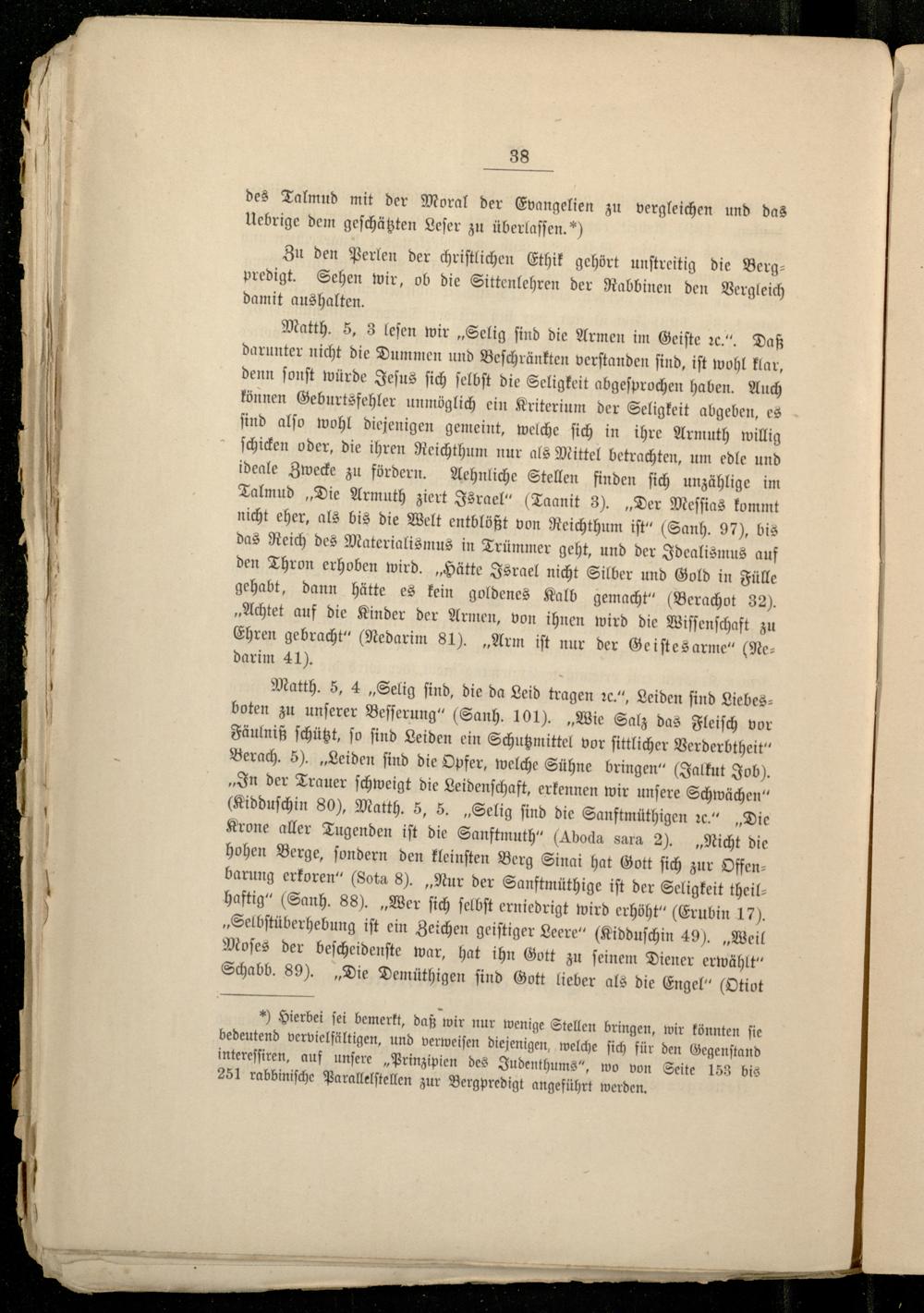 Matth . 5, 4„Selig ſind, die da Leid tragen ꝛc.“, Leiden find Liebes: boten zu unſerer Beſſerung“(Sanh. 101).„Wie Salz das Fleiſch vor Fäulniß ſchützt, ſo ſind Leiden ein Schutzmittel vor ſittlicher Verderbtheit“ Berach. 5).„Leiden ſind die Opfer, welche Sühne bringen“(Jalkut Job). „In der Trauer ſchweigt die Leidenſchaft, erkennen wir unſere Schwächen“ KGidduſchin 80), Matth . 5, 5.„Selig ſind die Sanftmüthigen 20.“„Die Krone aller Tugenden iſt die Sanftmuth“(Aboda Sara 2).„Nicht die hohen Berge, ſondern den kleinſten Berg Sinai hat Gott ſich zur Offenbarung erkoren“(Sota 8).„Nur der Sanftmüthige iſt der Seligkeit theilhaftig“(Sanh. 88).„Wer ſich ſelbſt erniedrigt wird erhöht“(Erubin 17). „Selbſtüberhebung iſt ein Zeichen geiſtiger Leere“ idduſchin 49).„Weil Moſes der beſcheidenſte war, hat ihn Gott zu ſeinem Diener erwählt“ Schabb. 89).„Die Demüthigen ſind Gott lieber als die Engel“(Otiot