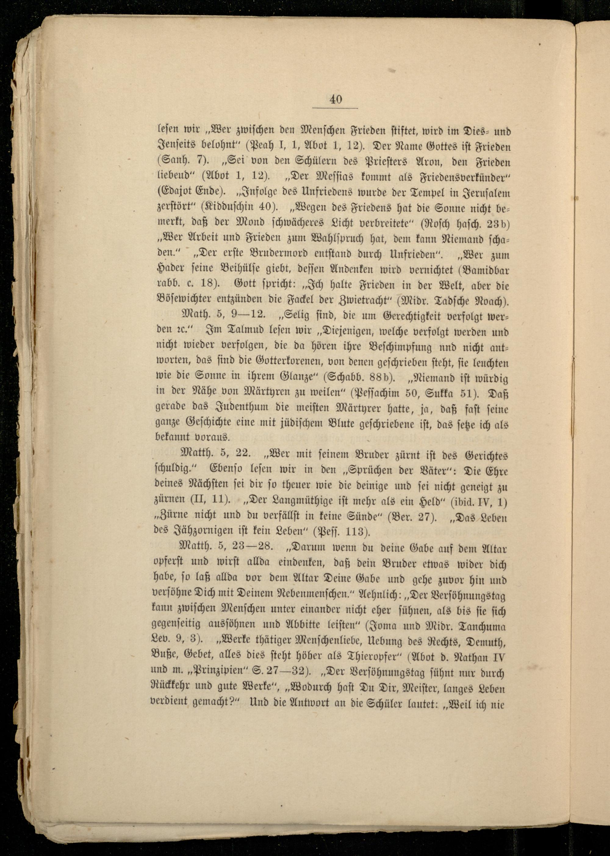 40 leſen wir„Wer zwiſchen den Menſchen Frieden ſtiftet, wird im Dies- und Jenſeits belohnt“(Peah I, 1, Abot 1, 12). Der Name Gottes iſt Frieden (Sanh. 7).„Sei von den Schülern des Prieſters Aron, den Frieden liebeud“(Abot 1, 12).„Der Meſſias kommt als Friedensverkünder“ (Edajot Ende).„Infolge des Unfriedens wurde der Tempel in Jeruſalem zerſtört“(Kidduſchin 40).„Wegen des Friedens hat die Sonne nicht bemerkt, daß der Mond ſchwächeres Licht verbreitete“(Roſch haſch. 236) „Wer Arbeit und Frieden zum Wahlſpruch hat, dem kann Niemand ſchaden.“„Der erſte Brudermord entſtand durch Unfrieden“„Wer zum Hader ſeine Beihülſe giebt, deſſen Andenken wird vernichtet(Bamidbar rabb. c. 18). Gott ſpricht:„Ich halte Frieden in der Welt, aber die Böſewichter entzünden die Fackel der Zwietracht“(Midr. Tadſche Noach).