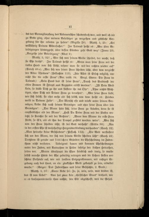 Matth . 5, 321„Wer ſich von feinem Weibe ſcheidet, der macht, daß ſie Ehe bricht“ Im Talmud heißt es:„Wenn man ſeine Frau mit der linken Hand von ſich ſtößt, nehme man ſie mit der rechten wieder auf“ (Sotah 464).„Wer ſich von feiner Frau ſcheiden läßt, über dem vergießt der Altar Thränen“(Peſſachim 113).„Für Alles iſt Erſatz möglich, nur nicht für die erſte Frau“(Ber. rabb. 34. Vergl. Stern: Die Frau im Talmud .)„Sein Haus das iſt ſeine Frau“,„Durch das Verdienſt der edlen Frauen iſt Israel aus Aegypten erlöſt worden“.„Iſt Dein Weib klein, ſo bücke Dich zu ihr und flüſtere ihr ins Ohr“. „Thue nichts Wichtiges, ohne Dich mit Deiner Frau zu berathen“.„Wer feine Fran liebt, wie ſich ſelbſt, ſie ehrt mehr als ſich ſelbſt, von dem heißt es: Frieden weilt in Deinem Zelte“.„Der Menſch eſſe und trinke unter ſeinem Ver— mögen, kleide ſich nach ſeinem Vermögen und ehre ſeine Frau über ſein Vermögen“.„Der Mann hüte ſich, ſeine Frau zu kränken, denn ſie iſt empfindlicher als der Mann“.„Haſt Du Deine Frau mit der Linken ver— letzt, ſo ſtreichle ſie mit der Rechten“.„Wenn dem Manne die erſte Frau ſtirbt, ſo iſt's, als ob ihm der Tempel zerſtört worden wäre“.„Wer ſich von der Frau ſcheiden läßt, iſt bei Gott verhaßt“(Gittin 90).„Nur in der erſten Ehe iſt wahrhaftige Herzensverbindung vorhanden“(Sanh. 22). „Man heirathe keine Geſchiedene“(Peſſach. 112).„Die Welt verfinſtert ſich um den Mann, der ſich von ſeinem Weibe ſcheiden läßt“(Sanh. 22). Trotzdem iſt gerade aus ſittlichen Gründen die Eheſcheidung im Judenthum nicht verboten. Uebrigens kamen und kommen Eheſcheidungen unter den Juden, mit Ausnahme in Polen infolge der frühen Heirathen, ſelten vor.„Waren überhaupt die Ehen friedlich und innig, ſo wurde ſelbſt manche Härte der Ehe geduldig ertragen und die Lehrer ſtellen uns ſchöne Beiſpiele auf, wie mit ſanftem Entgegenkommen, mit ruhiger Ergebung auch das Loos, an ein zänkiſches Weib geknüpft zu ſein, erduldet wurde.“(Geiger: Das Judenthum und ſeine Geſchichte, 2. Band.)