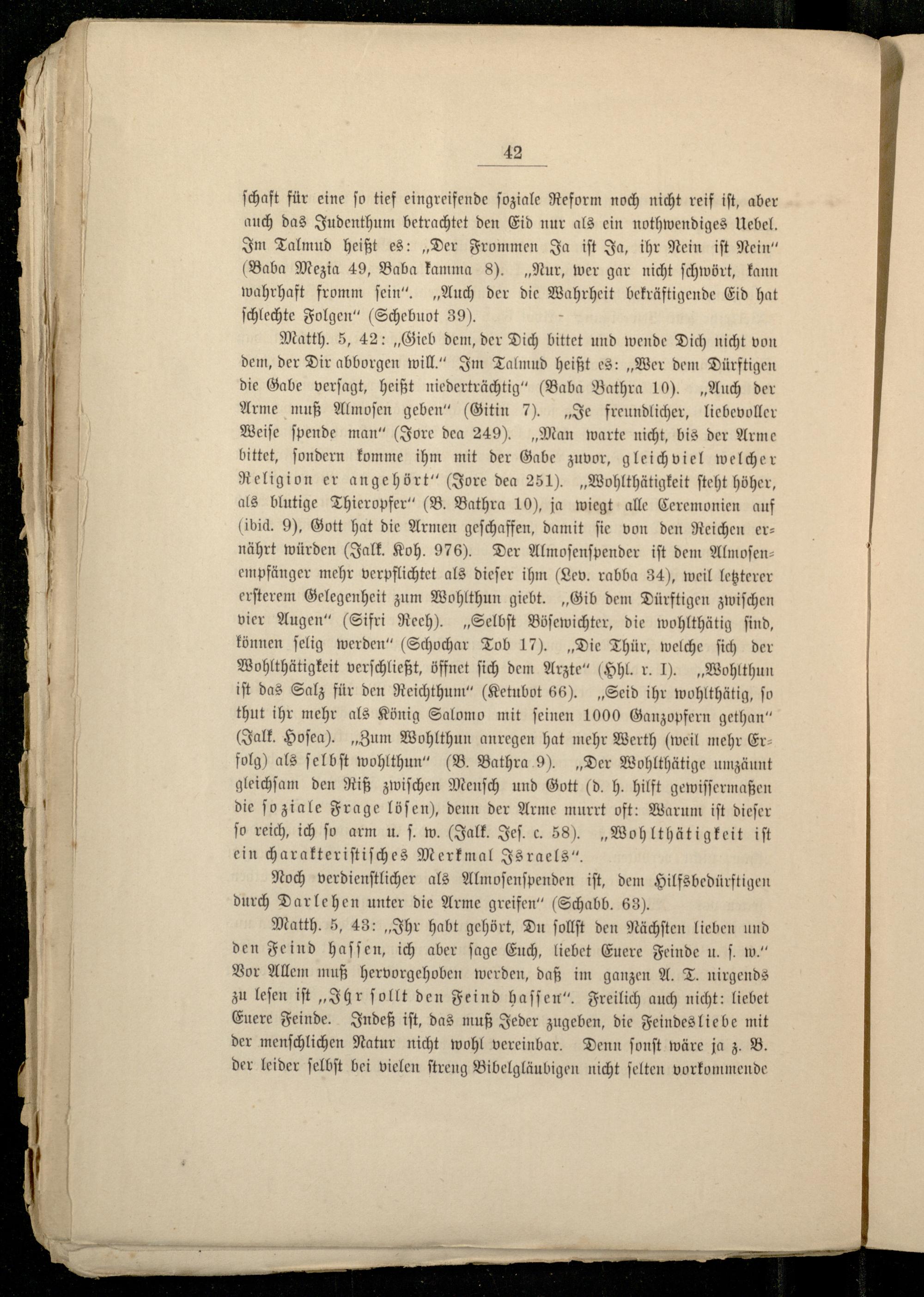ſchaft für eine ſo tief eingreifende ſoziale Reform noch nicht reif iſt, aber auch das Judenthum betrachtet den Eid nur als ein nothwendiges Uebel. Im Talmud heißt es:„Der Frommen Ja iſt Ja, ihr Nein iſt Nein“ (Baba Mezia 49, Baba kamma 8).„Nur, wer gar nicht ſchwört, kann wahrhaft fromm fein“.„Auch der die Wahrheit bekräftigende Eid hat ſchlechte Folgen“(Schebuot 39). Matth . 5, 42:„Gieb dem, der Dich bittet und wende Dich nicht von dem, der Dir abborgen will. Im Talmud heißt es:„Wer dem Dürftigen die Gabe verſagt, heißt niederträchtig“(Baba Bathra 10).„Auch der Arme muß Almoſen geben“(Gitin 7).„Je freundlicher, liebevoller Weiſe ſpende man“(Jore dea 249).„Man warte nicht, bis der Arme bittet, ſondern komme ihm mit der Gabe zuvor, gleichviel welcher Religion er angehört“(Jore dea 251).„Wohlthätigkeit ſteht höher, als blutige Thieropfer“(B. Bathra 10), ja wiegt alle Ceremonien auf ibid. 9), Gott hat die Armen geſchaffen, damit fie von den Reichen ernährt würden(Jalk. Koh. 976). Der Almoſenſpender iſt dem Almoſen I empfänger mehr verpflichtet als dieſer ihm(Lev. rabba 34), weil letzterer erſterem Gelegenheit zum Wohlthun giebt.„Gib dem Dürftigen zwiſchen| vier Augen“(Sifri Rech).„Selbſt Böſewichter, die wohlthätig find, P H können ſelig werden“(Schochar Tob 17).„Die Thür, welche ſich der Wohlthätigkeit verſchließt, öffnet ſich dem Arzte“(Hhl. r. D. „Wohlthun | iſt das Salz für den Reichthum“(Ketubot 66).„Seid ihr wohlthätig, ſo thut ihr mehr als König Salomo mit ſeinen 1000 Ganzopfern gethan“ (Jalk. Hoſea).„Zum Wohlthun anregen hat mehr Werth(weil mehr Er folg) als ſelbſt wohlthun“(B. Bathra 9).„Der Wohlthätige umzäunt gleichſam den Riß zwiſchen Menſch und Gott (d. h. hilft gewiſſermaßen die ſoziale Frage löſen), denn der Arme murrt oft: Warum iſt dieſer fo reich, ich ſo arm u. ſ. w.(Falk. Jeſ. c. 58).„Wo hlthätigkeit iſt ein charakteriſtiſches Merkmal Israels “. Noch verdienſtlicher als Almoſenſpenden iſt, dem Hilfsbedürftigen durch Darlehen unter die Arme greifen“(SSchabb. 63). Matth . 5, 43:„Ihr habt gehört, Du ſollſt den Nächſten lieben und den Feind haſſen, ich aber ſage Euch, liebet Euere Feinde u. ſ. w.“ . Vor Allem muß hervorgehoben werden, daß im ganzen A. T. nirgends zu leſen iſt„Ihr ſollt den Feind haſſen“. Freilich auch nicht: liebet Euere Feinde. Indeß iſt, das muß Jeder zugeben, die Feindes lie be mit der menſchlichen Natur nicht wohl vereinbar. Denn ſonſt wäre ja z. B. der leider ſelbſt bei vielen ſtreng Bibelgläubigen nicht ſelten vorkommende