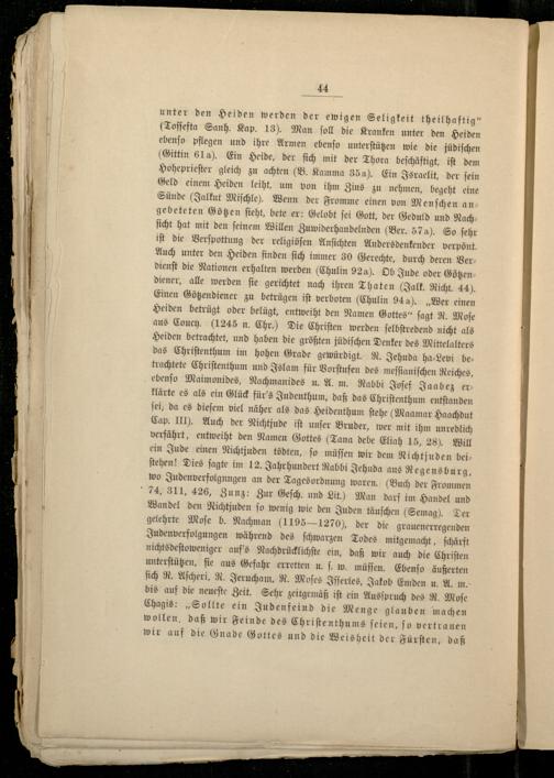 unter den Heiden werden der ewigen Seligkeit theilhaftig“ Toſſefta Sanh. Kap. 13). Man ſoll die Kranken unter den Heiden ebenſo pflegen und ihre Armen ebenſo unterſtützen wie die jüdiſchen (Gittin 61a). Ein Heide, der ſich mit der Thora beſchäftigt, iſt dem Hoheprieſter gleich zu achten(B. Kamma 35a). Ein Israelit, der ſein Geld einem Heiden leiht, um von ihm Zins zu nehmen, begeht eine Sünde(Jalkut Miſchle). Wenn der Fromme einen von Menſchen angebeteten Götzen ſieht, bete er: Gelobt ſei Gott , der Geduld und Nachſicht hat mit den ſeinem Willen Zuwiderhandelnden(Ber. 574 J. So ſehr iſt die Verſpottung der religiöſen Anſichten Andersdenkender verpönt. Auch unter den Heiden finden ſich immer 30 Gerechte, durch deren Ver— dienſt die Nationen erhalten werden(Chulin 92a). Ob Jude oder Götzen diener, alle werden ſie gerichtet nach ihren Thaten Jalk. Richt. 44). Einen Götzendiener zu betrügen iſt verboten(Chulin 944).„Wer einen Heiden betrügt oder belügt, entweiht den Namen Gottes“ ſagt R. Moſe aus Couch. (1245 n. Chr) Die Chriſten werden ſelbſtredend nicht als Heiden betrachtet, und haben die größten jüdiſchen Denker des Mittelalters das Chriſtenthum im hohen Grade gewürdigt. R. Jehuda ha⸗Levi be— trachtete Chriſtenthum und Islam für Vorſtufen des meſſianiſchen Reiches, ebenſo Maimonides , Nachmanides u. A. m. Rabbi Joſef Jaabez er klärte es als ein Glück für's Judenthum, daß das Chriſtenthum entſtanden ſei, da es dieſem viel näher als das Heidenthum ſtehe(Maamar Haachdut Cap. III. Auch der Nichtjude iſt unſer Bruder, wer mit ihm unredlich verfährt, entweiht den Namen Gottes(Tana debe Eliah 15, 28). Will ein Jude einen Nichtjuden tödten, ſo müſſen wir dem Nichtjuden bei— ſtehen! Dies ſagte im 12. Jahrhundert Rabbi Jehuda aus Regensb urg, wo Judenverfolgnngen an der Tagesordnung waren.(Buch der Frommen