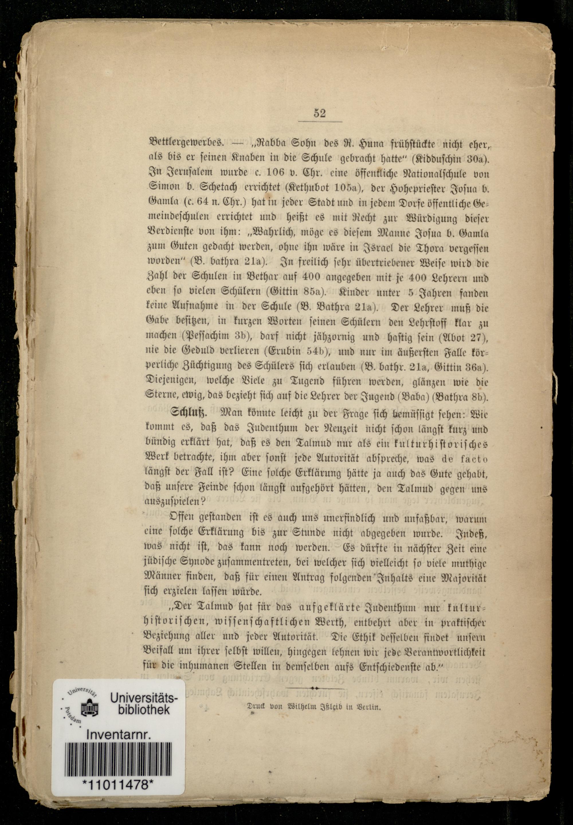 Schluß. Man könnte leicht zu der Frage ſich bemüſſigt ſehen: Wie kommt es, daß das Judenthum der Neuzeit nicht ſchon längſt kurz und bündig erklärt hat, daß es den Talmud nur als ein kulturhiſt oriſches Werk betrachte, ihm aber ſonſt jede Autorität abſpreche, was de facto längſt der Fall iſt? Eine ſolche Erklärung hätte ja auch das Gute gehabt,