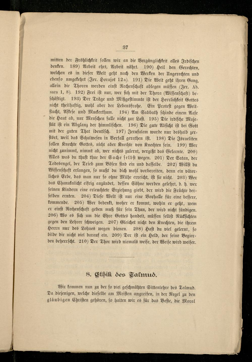 mitten der Fröhlichkeit ſollen wir an die Vergänglichkeit alles Irdiſchen denken. 189) Arbeit ehrt, Arbeit nährt. 190) Heil den Gerechten, welchen es in dieſer Welt geht nach den Werken der Ungerechten und ebenſo umgekehrt(Jer. Horajot 124). 191) Die Welt geht ihren Gang, allein die Thoren werden einſt Rechenſchaft ablegen müſſen(Jer. Ab. sara 1, 8). 192) Frei iſt nur, wer ſich mit der Thora(Wiſſenſchaft) beſchäftigt. 193) Der Träge und Mißgeſtimmte iſt der Herrlichkeit Gottes nicht theilhaftig, wohl aber der Lebensfrohe. Ein Proteſt gegen Welt— flucht, Aſteſe und Muckerthum. 194) Am Sabbath ſchinde einem Aaſe die Haut ab, nur Menſchen falle nicht zur Laſt. 195) Die irdiſche Majeſtät iſt ein Abglanz der himmliſchen. 196) Die gute Abſicht iſt bei Gott mit der guten That identiſch. 197) Jeruſalem wurde nur deshalb zerſtört, weil das Schulweſen in Verfall gerathen iſt. 198) Die Israeliten ſollen Knechte Gottes, nicht aber Knechte von Knechten ſein. 199) Wer nicht zunimmt, nimmt ab, wer nichts zulernt, vergißt das Gelernte. 200) Alles was du thuſt thue der Sache ſelbſt wegen. 201) Der Satan, der Todesengel, der Trieb zum Böſen ſind ein und daſſelbe. 202) Willſt du Wiſſenſchaft erlangen, fo mußt du dich wohl vorbereiten, denn ein väter— liches Erbe, das man nur ſo ohne Mühe erreicht, iſt ſie nicht. 203) Wer das Chanukalicht eifrig anzündet, deſſen Söhne werden gelehrt, d. h. wer ſeinen Kindern eine erleuchtete Erziehung giebt, der wird die Früchte derſelben ernten. 204) Dieſe Welt iſt nur eine Vorhalle für eine beſſere, kommende. 205) Wer bedenkt, woher er kommt, wohin er geht, wem er einſt Rechenſchaft geben muß für ſein Thun, der wird nicht ſündigen. 206) Wo es ſich um die Ehre Gottes handelt, müſſen ſelbſt Rückſichten gegen den Lehrer ſchweigen. 207) Gleichet nicht den Knechten, die ihrem Herrn nur des Lohnes wegen dienen. 208) Haſt du viel gelernt, ſo bilde dir nicht viel darauf ein. 209) Der iſt ein Held, der ſeine Begier— den beherrſcht. 210) Der Thor wird niemals weiſe, der Weiſe wird weiſer.