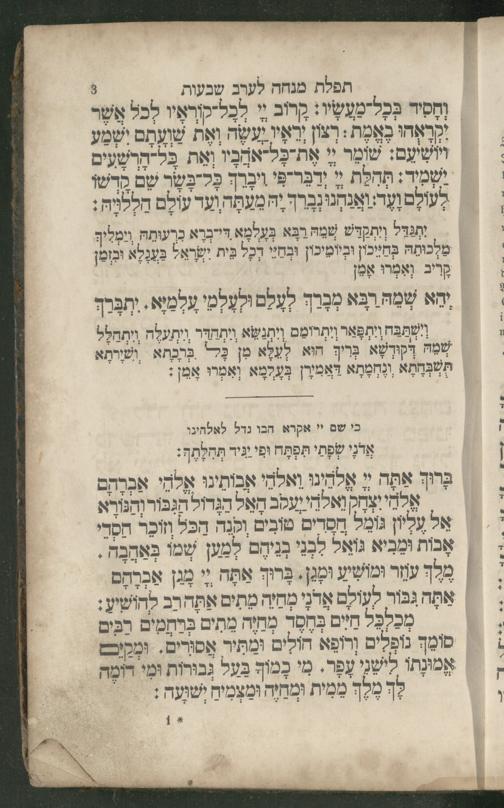 בָּרוּךְ אַתָּה יְיָ אֱלֹהֵינוּ וֵאלֹהֵי אֲבוֹתֵינוּ אֱלֹהֵי אַבְרָהָם אֱלֹהֵי יִצְחָק וֵאלֹהֵי יַעֲקֹב הָאֵל הַגָּדוֹל הַגִּבּוֹר וְהַנּוֹרָא אֵל עֶלְיוֹן גּוֹמֵל חֲסָדִים טוֹבִים וְקְנָה הַכֹּל וְזוֹכֵר חַסְדֵי אָבוֹת וּמֵבִיא גוֹאֵל לִבְנֵי בְנֵיהֶם לְמַעַן שְׁמוֹ בְּאַהֲבָה. מֶלֶךְ עוֹזֵר וּמוֹשִׁיעַ וּמָגֵן. בָּרוּךְ אַתָּה יְיָ מָגֵן אַבְרָהָם אַתָּה גִּבּוֹר לְעוֹלָם אֲדֹנָי מְחַיֶה מַתִים אַתָּה רַב לְהוֹשִׁיעַ: מְכַלְכָּל חַיִּים בְּחֶסֶד מְחַיֶה מֵתִים בְּרַחֲמִים רַבִּים סוֹמֵךְ נוֹפְלִים וְרוֹפֵא חוֹלִים וּמַתִּיר אֲסוּרִים. וּמְקַיָּם אֱמוּנָתוֹ לִישֵׁנִי עָפָר. מִי כָמוֹךְ בַּעַל גְבוּרוֹת וּמִי דוֹמֶה לָךְ מֶלֶךְ מֵמִית וּמְחַיֶה וּמַצְמִיחַ יְשׁוּעָה: