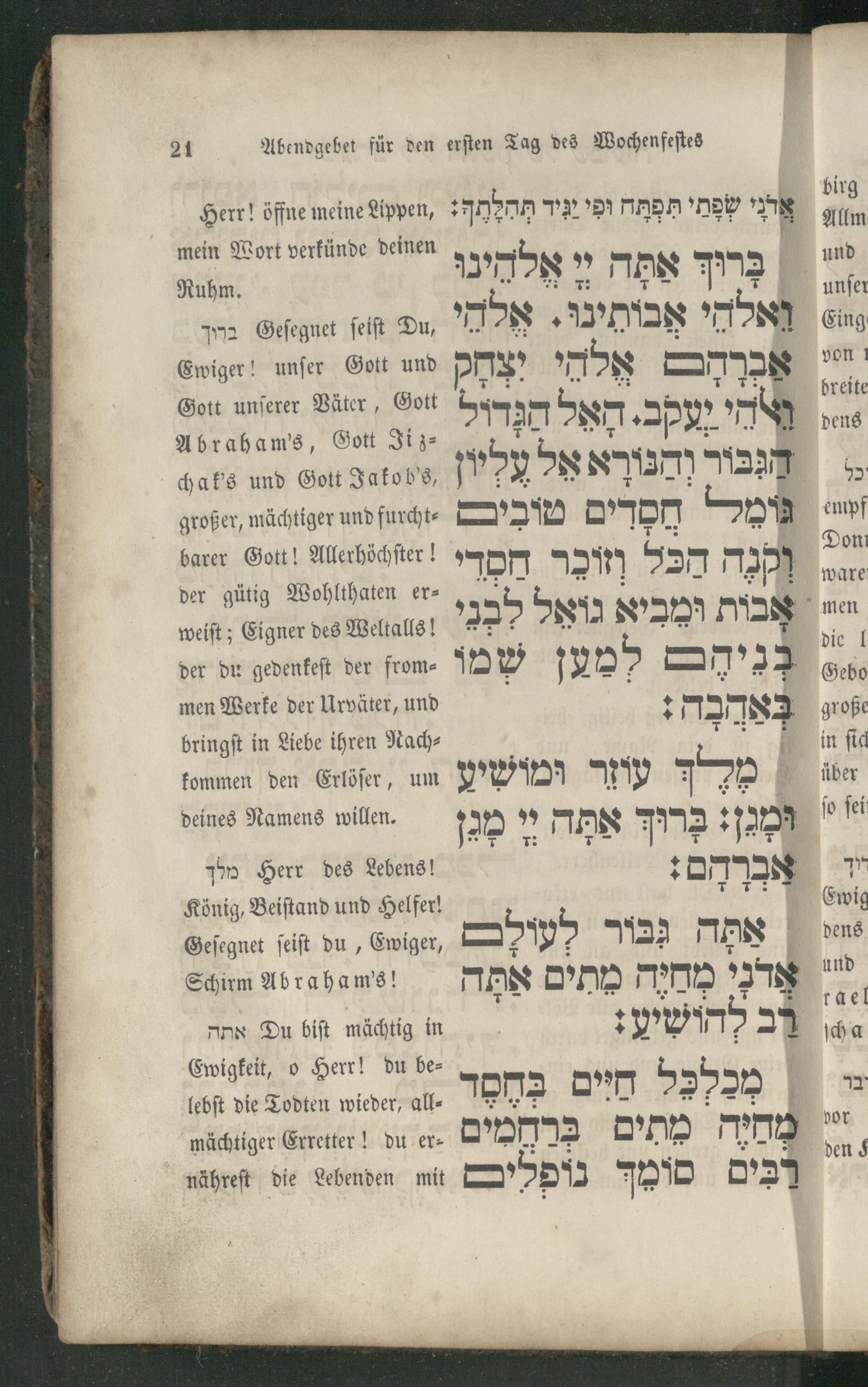 Geſegnet ſeiſt Du, ברוד Ewiger! unſer Gott und Gott unſerer Väter, Gott Abraham's, Gott Jiz⸗ chak's und Gott Jakob's, großer, mächtiger und furcht⸗ barer Gott! Allerhöchſter! der gütig Wohlthaten er⸗ weiſt; Eigner des Weltalls! der dr gedenkeſt der from⸗ men Werke der Urväter, und bringſt in Liebe ihren Nach⸗ kommen den Erlöſer, um deines Namens willen.