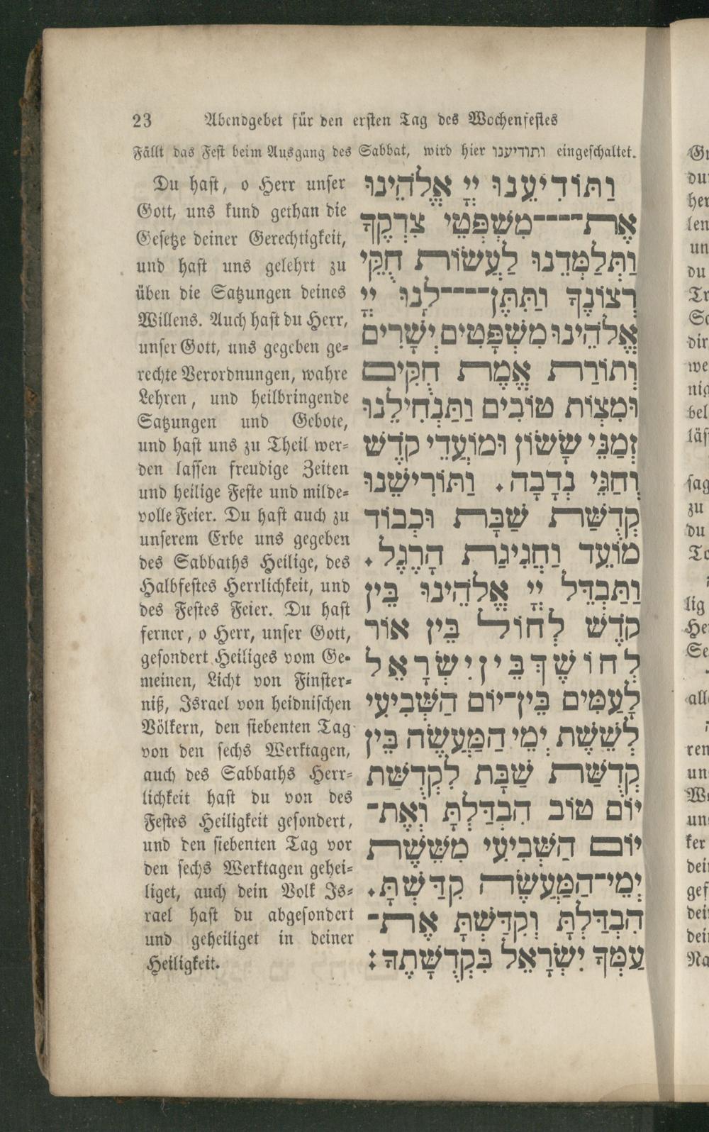 Du haft, o Herr unſer Gott, uns kund gethan die Geſetze deiner Gerechtigkeit, und haſt uns gelehrt zu üben die Satzungen deines Willens. Auch haſt du Herr, unſer Gott, uns gegeben gerechte Verordnungen, wahre Lehren, und heilbringende Satzungen und Gebote, und haſt uns zu Theil werden laſſen freudige Zeiten und heilige Feſte und mildevolle Feier. Du haſt auch zu unſerem Erbe uns gegeben des Sabbaths Heilige, des Halbfeſtes Herrlichkeit, und des Feſtes Feier. Du haſt ferner, o Herr, unſer Gott, geſondert Heiliges vom See meinen, Licht von Finſterniß, Israel von heidniſchen