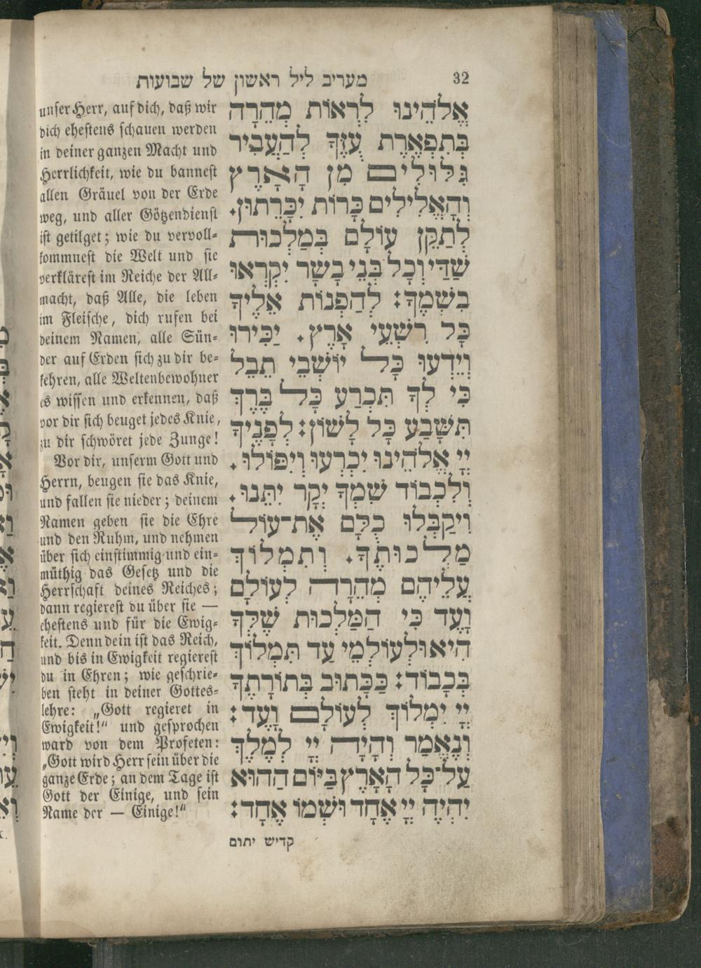 unſer Herr, auf dich, daß wir dich eheſtens ſchauen werden in deiner ganzen Macht und Herrlichkeit, wie du banneſt allen Gräuel von der Erde weg, und aller Götzendienſt ſſt getilget; wie du vervollſommneſt die Welt und ſie verkläreſt im Reiche der Allnacht, daß Alle, die leben im Fleiſche, dich rufen bei deinem Namen, alle Sünder auf Erden ſich zu dir beſehren, alle Weltenbewohner s wiſſen und erkennen, daß vor dir ſich beuget jedes Knie, uu dir ſchwöret jede Zunge! Vor dir, unſerm Gott und herrn, beugen ſie das Knie, und fallen fie nieder; deinem Namen geben ſie die Ehre und den Ruhm, und nehmen über ſich einſtimmig und einö, das Geſetz und die Herrſchaft deines Reiches; dann regiereſt du über ſie—