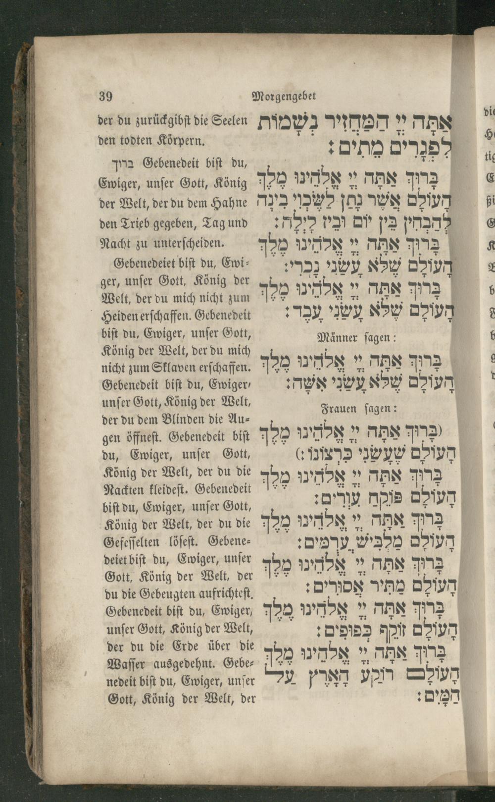 Ewiger, unſer Gott, König 790 mod 3 MAN 13 der Welt, der du dem Hahne לש2כוי בינ M) WN dem] den Trieb gegeben, Tag und: 5* M יום 72 mama Nacht zu unterſcheiden. 750 בּרוּך אתה 6 אלהינו k- שלא עשני נכרי: Dim er, unſer Gott, König der„"לא e, 00. d ָ Heiden erſchaffen. Gebenedeit שלא עשני עַבָר: DD biſt du, Ewiger, unſer Gott,