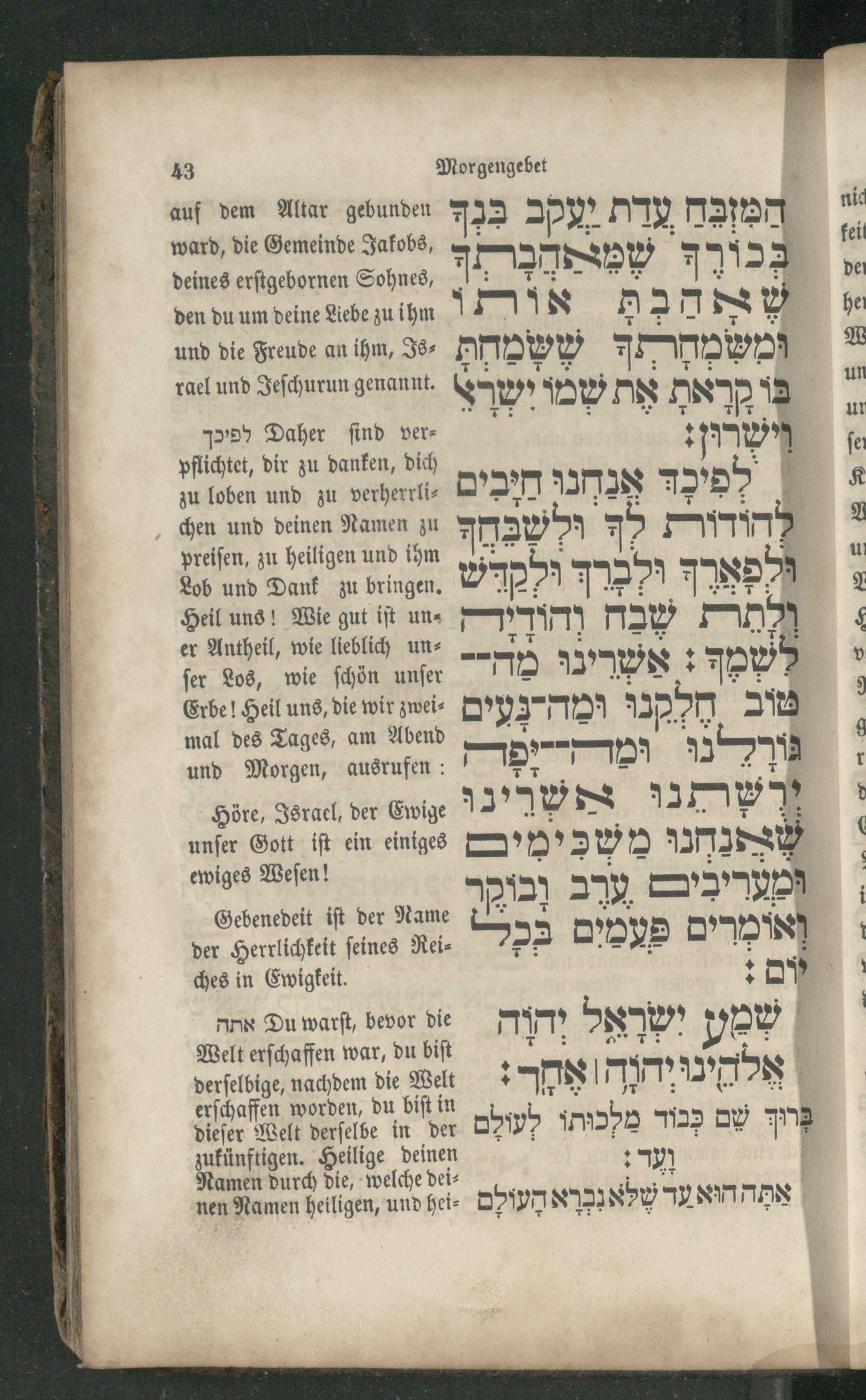 Daher find ver- לפיכך pflichtet, dir zu danken, dich zu loben und zu verherrli⸗ chen und deinen Namen zu preiſen, zu heiligen und ihm Lob und Dank zu bringen. Heil uns! Wie gut iſt un er Antheil, wie lieblich un⸗ ſer Los, wie ſchön unſer Erbe! Heil uns, die wir zwei⸗ mal des Tages, am Abend und Morgen, ausrufen: