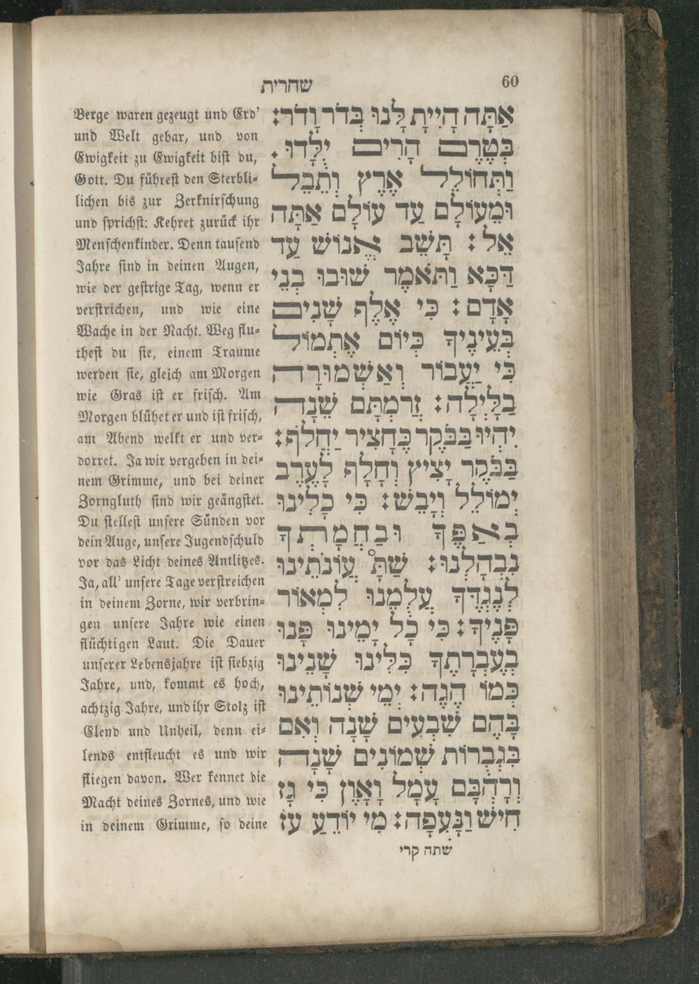 Berge waren gezeugt und Erd’ und Welt gebar, und von Ewigkeit zu Ewigkeit biſt du, Gott. Du führeſt den Sterblilichen bis zur Zerknirſchung und ſprichſt: Kehret zurück ihr Menſchenkinder. Denn tauſend Jahre ſind in deinen Augen, wie der geſtrige Tag, wenn er verſtrichen, und wie eine Wache in der Nacht. Weg flutheſt du fie, einem Traume werden ſie, gleich am Morgen wie Gras iſt er friſch. Am Morgen blühet er und{ft friſch, am Abend welkt er und verdorret. Ja wir vergehen in deinem Grimme, und bei deiner Zorngluth ſind wir geängſtet. Du ſtelleſt unſere Sünden vor dein Auge, unſere Jugendſchuld vor das Licht deines Antlitzes. Ja, all' unſere Tage ver ſtreichen in deinem Zorne, wir verbringen unſere Jahre wie einen flüchtigen Laut. Die Dauer unſerer Lebensjahre iſt ſiebzig