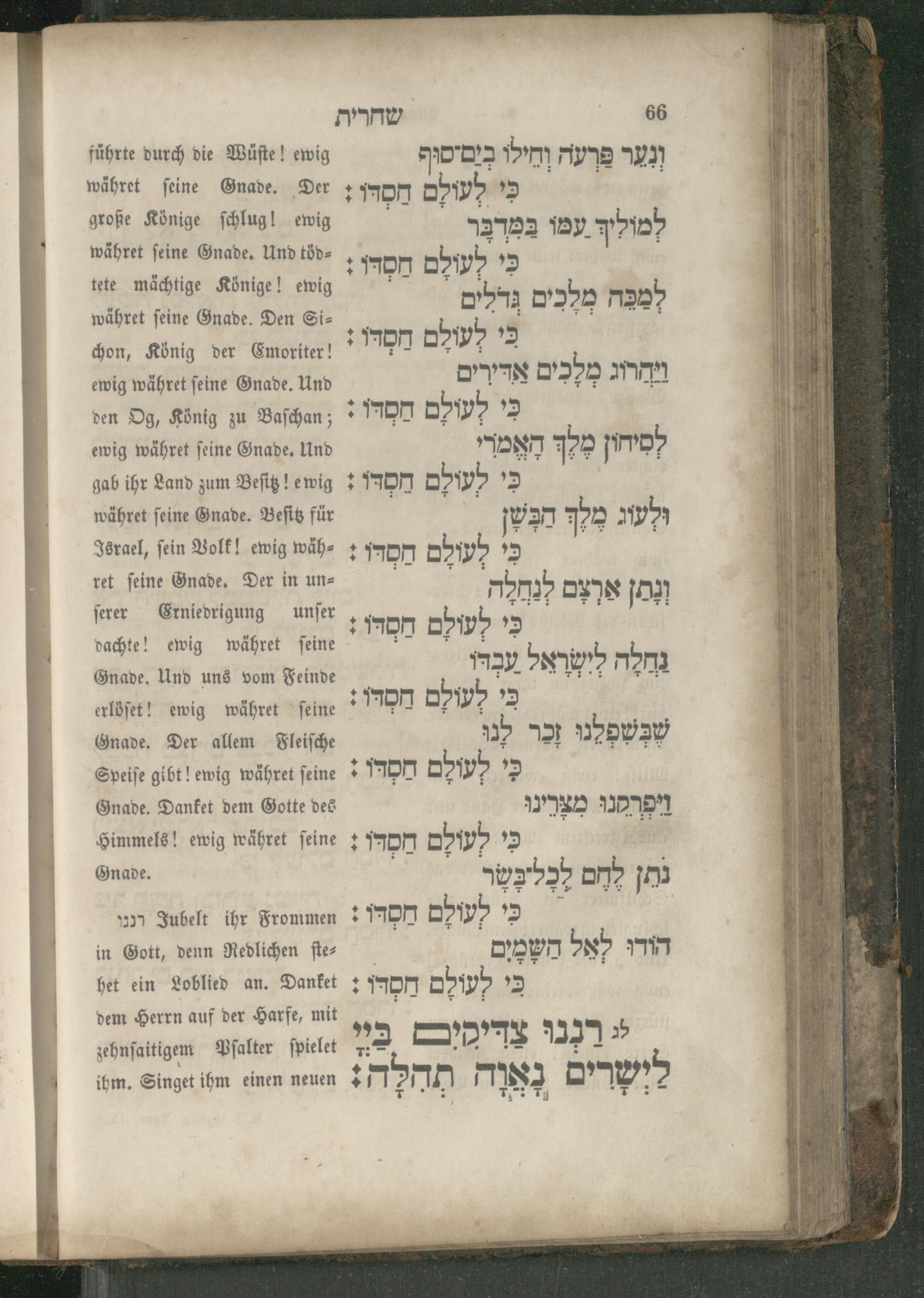 führte durch die Wüſte! ewig währet Gnade. Der große Könige ſchlug! ewig währet feine Gnade. Und tödtete mächtige Könige! ewig währet ſeine Gnade. Den Sichon, König der Emoriter! ewig währet ſeine Gnade. Und den Og, König zu Baſchan;