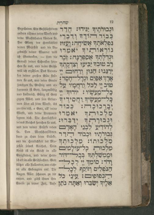 Ergründen. Ein Geſchlecht dem andern rühmet deine Werke und deine Machtthaten künden fie. Der Glanz der Herrlichkeit deiner Majeſtät und die Begebniſſe deiner Wunder will ich überdenken.— Und die Gewalt deiner Schrecken ſprechen ſte aus, und deine Größe will ich erzählen. Das Andenken deiner großen Güte ſtrömen ſte aus, und deine Gnade jauchzen ſte. Gnädig und erbarmend iſt Gott, langmüthig und huldreich. Gütig iſt Gott gegen Alles, und fein Erbarmen über all ſeine Werke. Es pre iſen dich, o Gott, all' deine Werke, und deine Frommen ſegnen dich. Die Herrlichkeit de ines Reiches ſprechen fie aus, und von deiner Stärke reden fie, Den Menſchenſoöhnen kund zu thun ſeine Stärke, und die Herrlichkeit der Majeſtät ſeines Reiches. Dein Reich iſt ein Reich in alle Ewigkeiten, und deine Herrſch aft in alle Geſchlechter. Gott ſtützet alle Fallenden, und richtet alle Gebeugten auf. Die Augen Aller ſchauen zu dir empor, und gibſt ihnen ihre Speiſe zu feiner Zeit. Auf