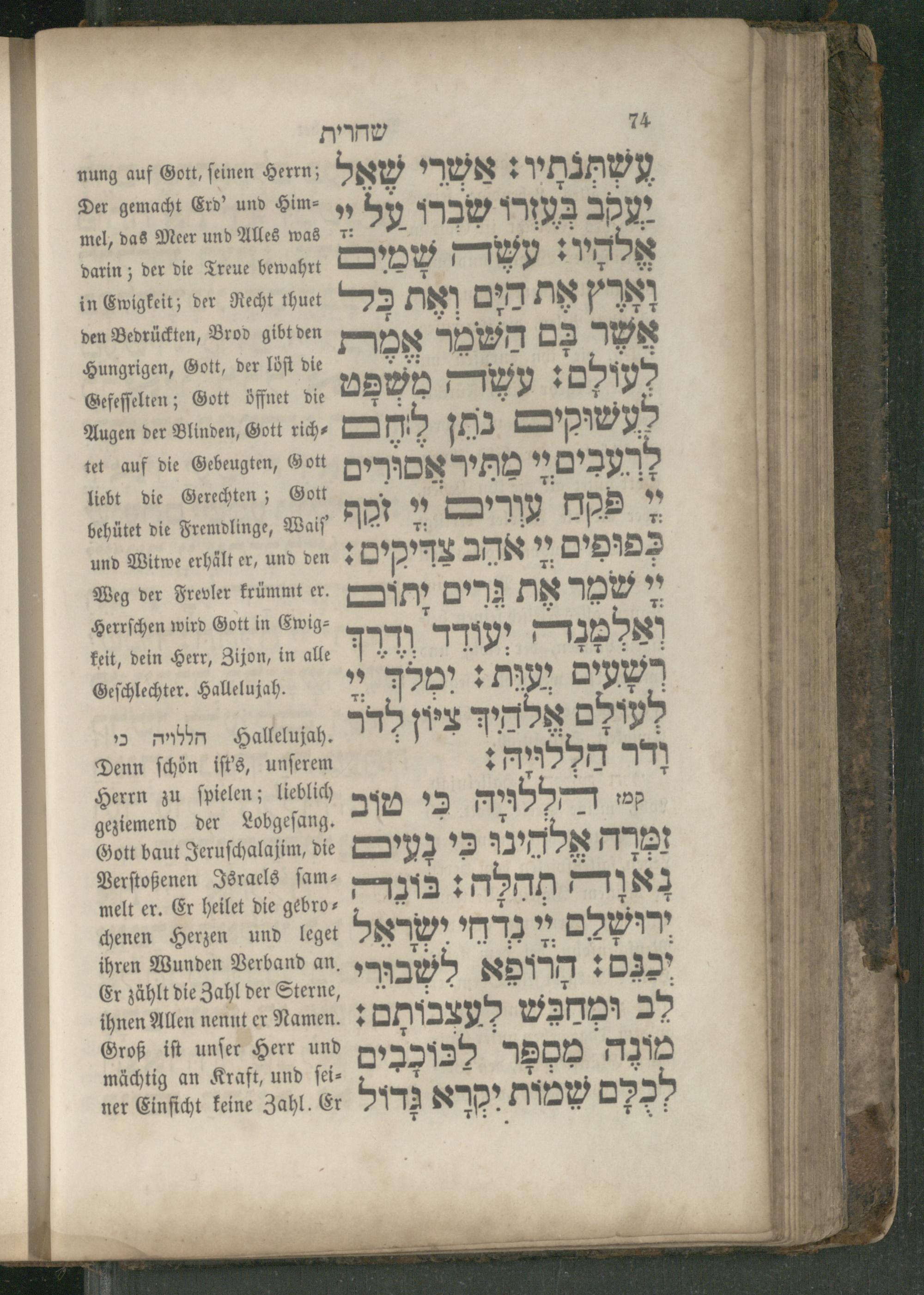 nung auf Gott, feinen Herrn; Der gemacht Erd’ und Himmel, das Meer und Alles was darin; der die Treue bewahrt in Ewigkeit; der Recht thuet den Bedrückten, Brod gibt den Hungrigen, Gott, der löſt die Gefeſſelten; Gott öffnet die Augen der Blinden, Gott richtet auf die Gebeugten, Gott liebt die Gerechten; Gott behütet die Fremdlinge, Waiſ und Witwe erhält er, und den Weg der Frevler krümmt er. Herrſchen wird Gott in Ewigkeit, dein Herr, Zijon, in alle Geſchlechter. Hallelujah.