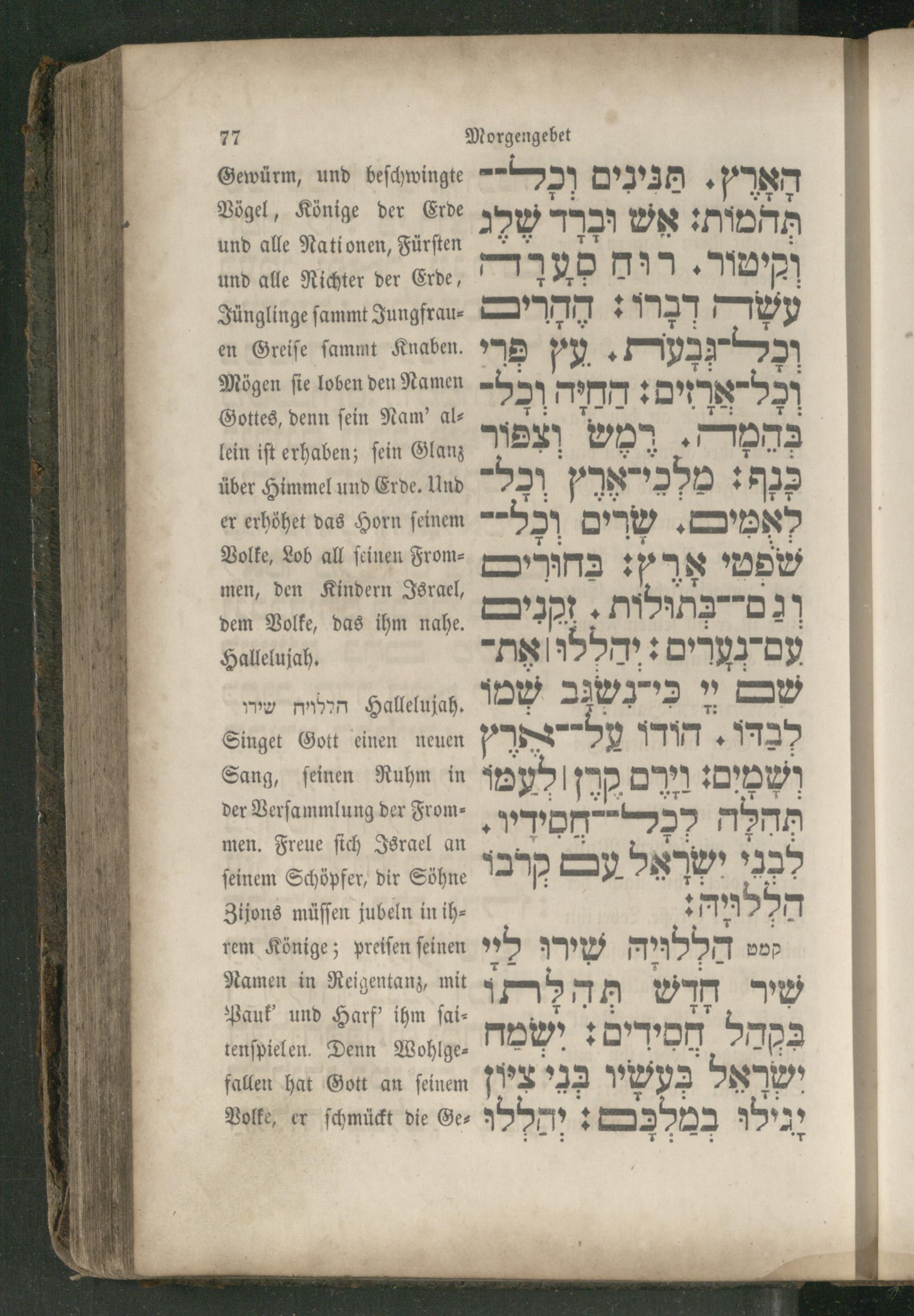 Gewürm, und beſchwingte Vögel, Könige der Erde und alle Nationen, Fürſten und alle Richter der Erde, Jünglinge ſammt Jungfrauen Greiſe ſammt Knaben. Mögen ſie loben den Namen Gottes, denn ſein Nam' allein iſt erhaben; ſein Glanz über Himmel und Erde. Und er erhöhet das Horn ſeinem Volke, Lob all feinen Frommen, den Kindern Israel, dem Volke, das ihm nahe. Hallelujah.