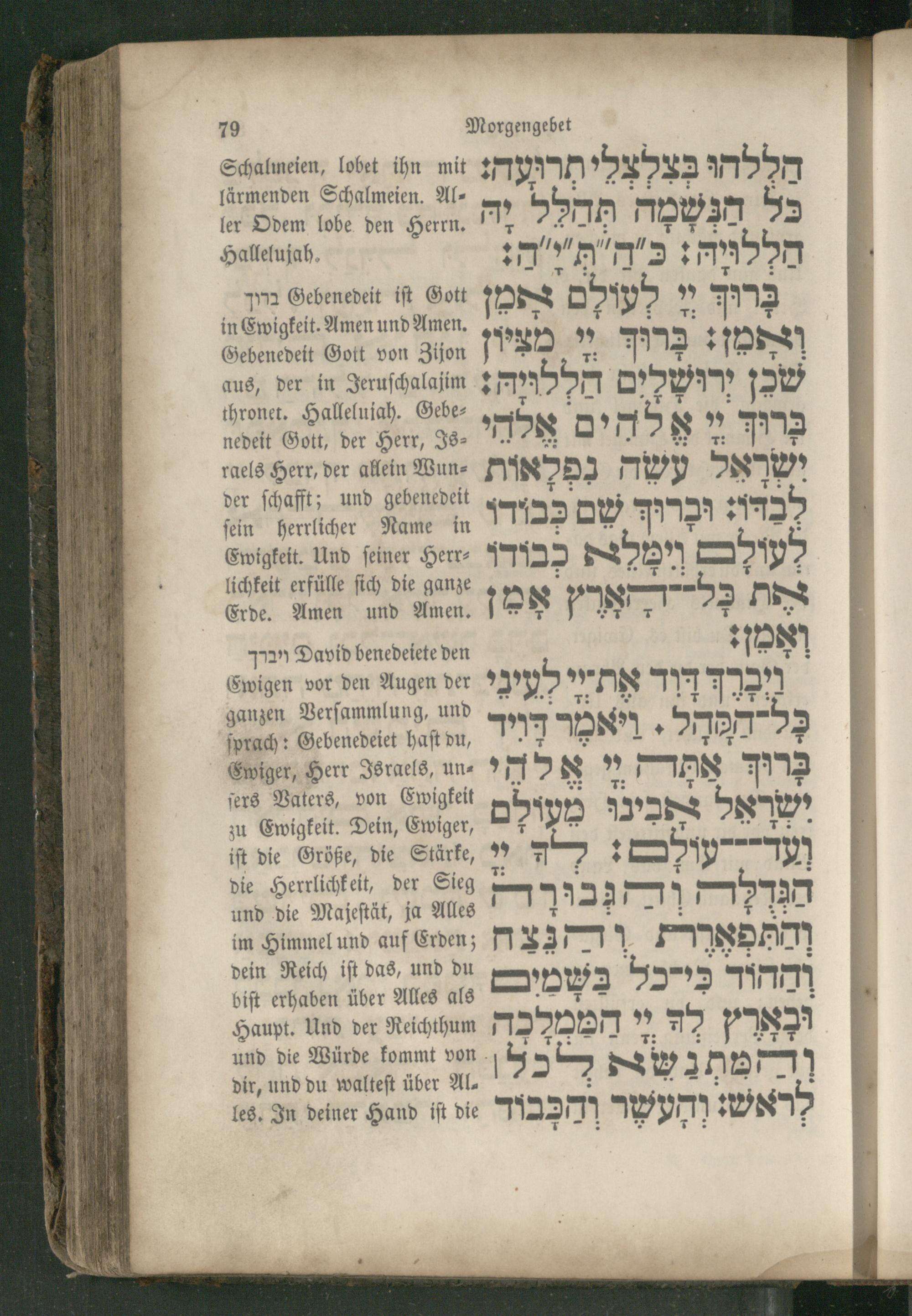 Pan David benedeiete den Ewigen vor den Augen der ganzen Verſammlung, und ſprach: Gebenedeiet Haft du, Ewiger, Herr Israels, unſers Vaters, von Ewigkeit zu Ewigkeit. Dein, Ewiger, iſt die Größe, die Stärke, die Herrlichkeit, der Sieg und die Majeſtät, ja Alles im Himmel und auf Erden; dein Reich iſt das, und du biſt erhaben über Alles als Haupt. Und der Reichthum und die Würde kommt von dir, und du walteſt über Alles. In deiner Hand iſt die