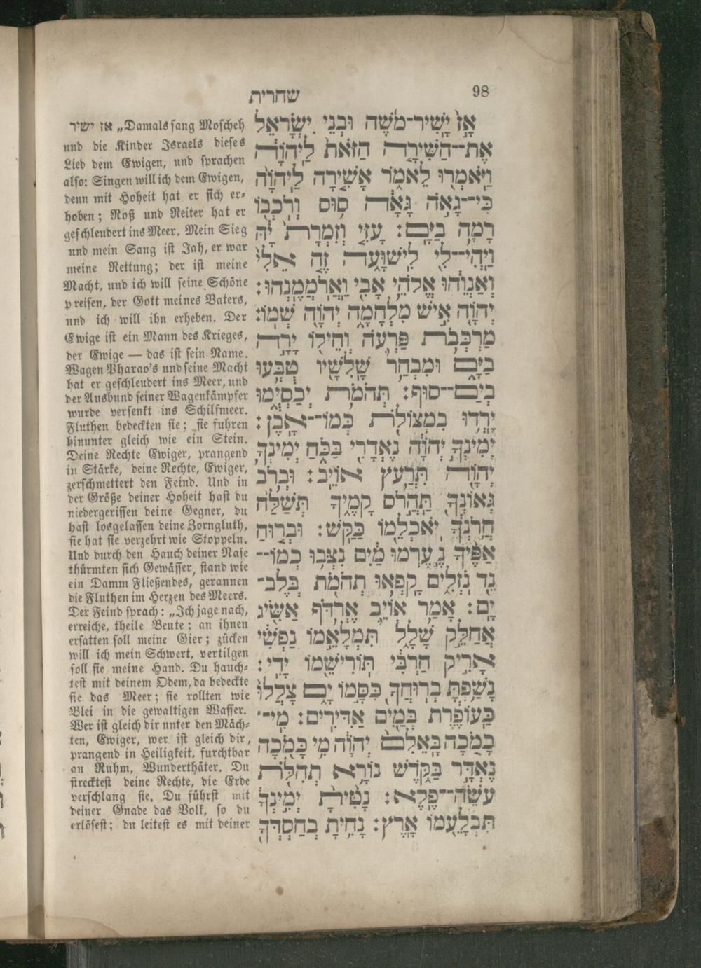 „Damals ſang Moſcheh אז ישיר und die Kinder Israels dieſes Lied dem Ewigen, und ſprachen alſo: Singen will ich dem Ewigen, venn mit Hoheit hat er ſich er⸗ hoben; Noß und Reiter hat er geſchleudert ins Meer. Mein Sieg und mein Sang iſt Jah, er war meine Rettung; der iſt meine Macht, und ich will ſeine Schöne p reiſen, der Gott meines Vaters, und ich will ihn erheben. Der Ewige iſt ein Mann des Krieges, der Ewige— das iſt ſein Name. Wagen Pharao's und ſeine Macht hat er geſchleudert ins Meer, und der Ausbund ſeiner Wagenkämpfer verſenkt ins Schilfmeer. 2