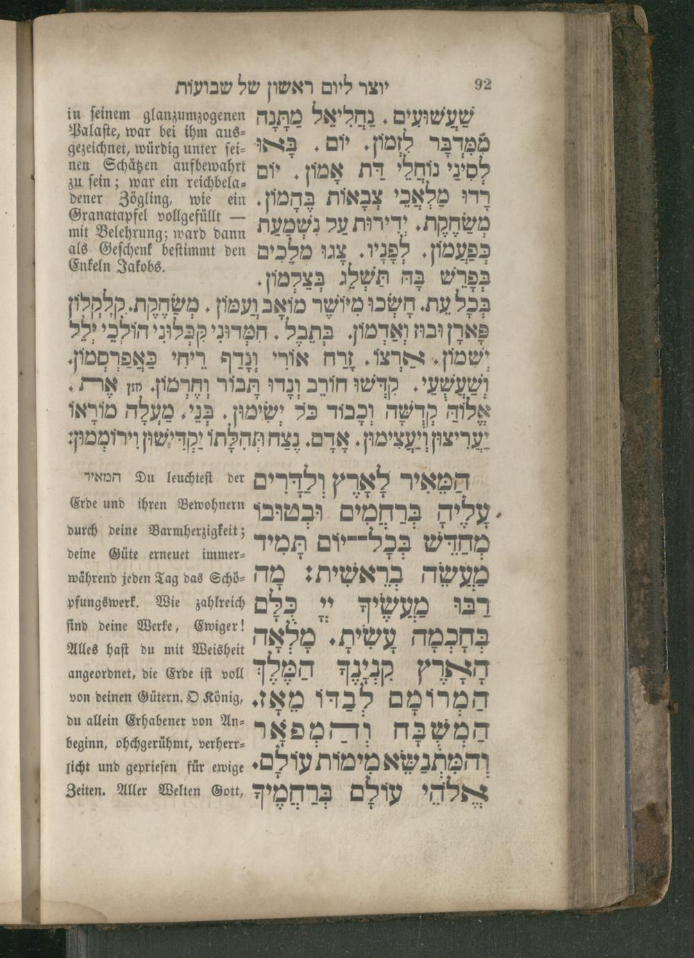 92 יוצר ליום ראשון של שבועות i us⸗ ö. 7 7, 127192 לומון. יום, בו gezeichnet, würdig unter ſei⸗ לסיני נוחלי דת nen Schätzen aufbewahrt Dr io ידו מלא ה ויר"(' ה".0900 zu ſein; war ein M מַלָאבִי צְבָאות One ha 2 ein. M2 ranatapfel vollgefüllt—; ‚PRO ידירוּת על mit Belehrung;* dann DD hd mord צנו מלכים als Geſchenk beftimmt den ma oe תשלג בְּצַלְמון, RAD n dsr; מואָב ועמון. משְחְקת. קלקלון פָארֶן וב fe gde בתבל. המרונ קבונ הולכי ילל ישמון. MMS אורי 5 ריחי ‚DNS ושעשעי. קדשו חורב ונדו הבור וחרמון. חן R העודי+. 1.* 1. 4 אלוה קְדשָה וְכְבוד בל ישימון. 33 מעלָה מורָאו המאיר לְאָרֶץ וְלדרִים Du 158 der המאיר עליה ברחמים ובמובו Erde und ihren Bewohnern durch deine Barmherzigkeit;, , deine Güte erneuet immer⸗ DDR R; 232 d My מעשה בראשית: מה während jeden Tag das Schöͤ⸗ רבו מעשיך 99 vyfungs wert. Wie zahlreich ih ., 5.=!וו find deine Werke, MD עש 45 מְלְאָה Alles haft du mit Weisheit angeordnet, die Erde iſt voll on 72 7X7] המרומם 1425 von deinen Gütern. O König, 288 D חמש 2 וד- מ פא taten von An⸗ וריע du >" וכל שא beginn, ohchgerühmt, verherr⸗ והמתנשא מימות עולםי für ewige 1 Jod עילם guten. Aller Welten Gott, os