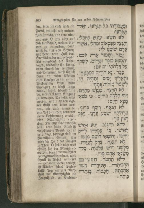 ſen, fern ſei euch ſolch ein Frevel, entzieht euch meinem Dienſte nicht, und artet nimmer aus. O lade nicht auf dich die Schuld, meinen Namen zu entweihen, dann wirſt du frei von Schmerz und Leid; denn Heil dem Sterblichen der mit gehorcht. Sei eingedenk des Ruhetages, beobachte ihn ſtreng, dann findeſt du Erlöſung und Befreiung, wirſt täglich dann an meine Pforten eilen. Verehre du für meiner Verheißung Lohn deine Erzeuger; du lebeſt lange dann, ſteheſt lebenskräftig da, meiner Thore Eingang zu bewachen. Du ſollſt nicht morden, und nicht den eigenen Geiſt vom Leben trennen, wie auch immer ſei dein Los hienieden; denn wer meine Veſtimmung erreicht, wird Glückſeligkeit erreichen. Du ſollſt nicht unkeuſch ſein; denn ſolche Gluth iſt verzehrender Brand, wer fie verdrängt, ſchwelgt einſt im himmliſchen Genuß, ihm wird die Huld des Ewigen zu Theil. O ſtehle nicht was ehrlich ſich der Menſch erworben, denn fremdes, ſchwer errungenes Eigenthum, wird ſchnell in Nichts zerfließen — wer mein Gebot verletzt, iſt Räuber ſeines Seelenheils. Lege nie zum Nachtheil der Gerechtigkeit ein Jeugniß ab; der Verleum