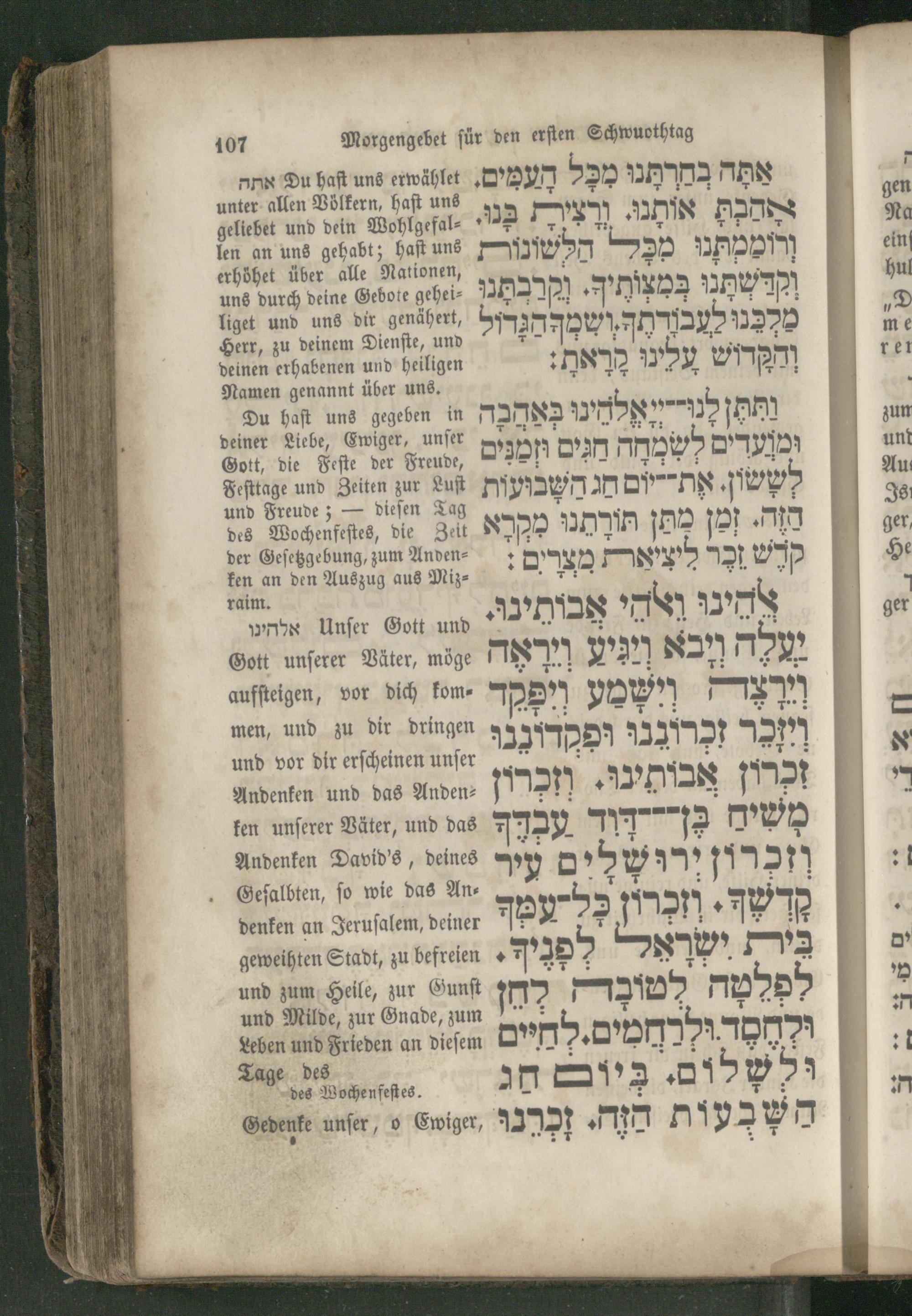 Du haſt uns gegeben in deiner Liebe, Cwiger, unſer Gott, die Feſte der Freude, Feſttage und Zeiten zur Luſt und Freude;— dieſen Tag des Wochenfeſtes, die Zeit der Geſetzgebung, zum Andenken an den Auszug aus Mizraim.