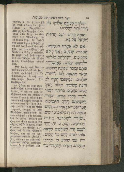 Hätteſt du deine wun⸗ אם derlieblichen Lehren nicht ver⸗ breitet, ſo würden auch die Beſtimmungen des Himmels und der Erde nicht beſtehen, und dennoch haſt du jene nur einem unbedeutenden Völkchen über⸗ liefert, der Liebe und des Eides eingedenk, welchen du ihren Vorfahren zugeſchworen; da⸗ rum wünſcheſt du ſie tadellos, daß ſie deinen Geſetzen mit Herz und Sinn zugethan ſein mögen, daß ſie im Kreiſe deiner Frommen ihre Einſicht dar⸗ thun, daß ſie dein Bündniß beachten, und auf den Tu⸗ gendpfaden wandeln. Zu jener Zeit, als du ihnen deine voll⸗ keinmenen Geſetze verkündet, ſtanden fie in heiliger Ehr⸗