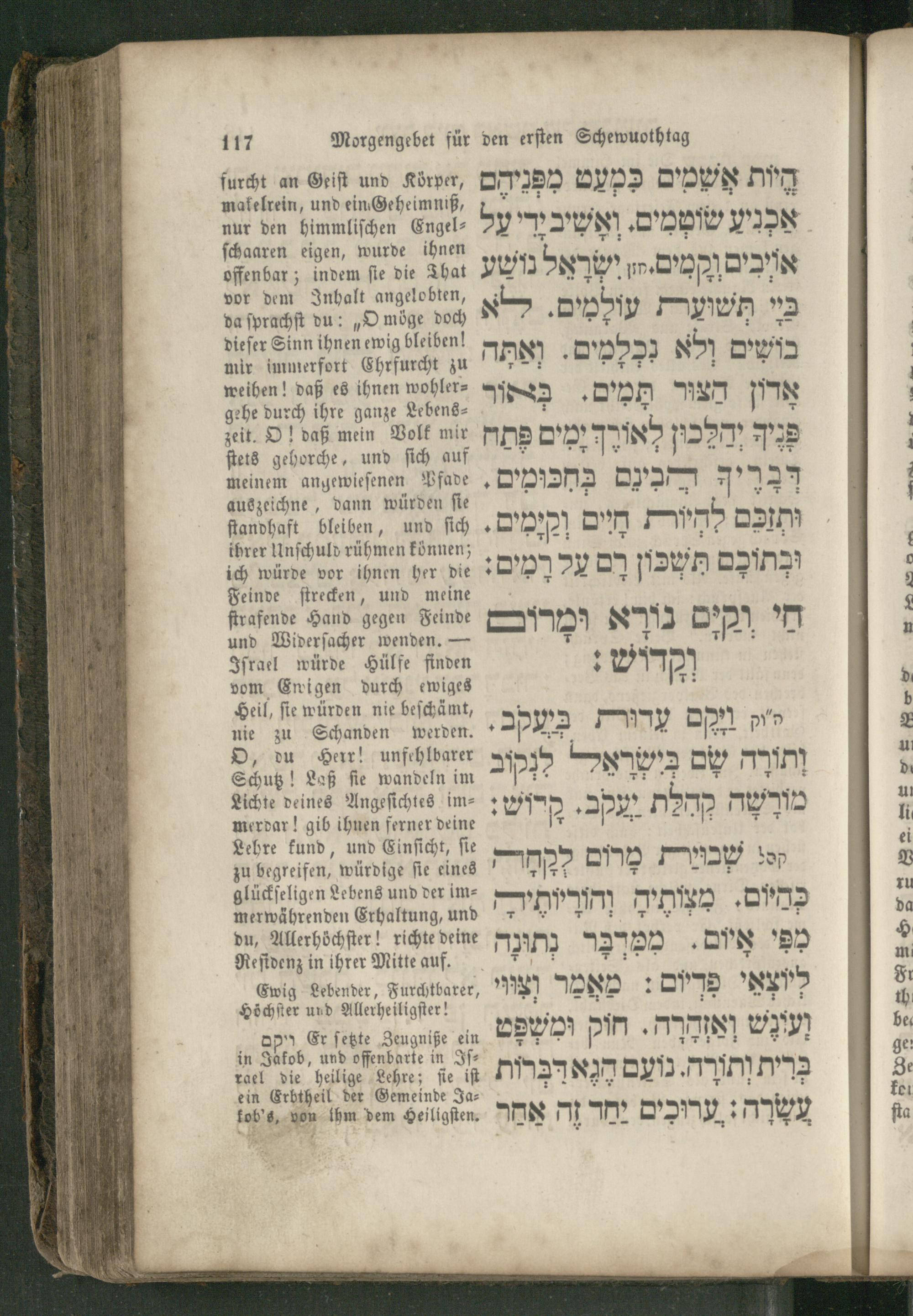furcht an Geiſt und Körper, makelrein, und ein Geheimniß, nur den himmliſchen Engelſchaaren eigen, wurde ihnen offenbar; indem ſie die That vor dem Inhalt angelobten, da ſprachſt du:„O möge doch dieſer Sinn ihnen ewig bleiben! mir immerfort Ehrfurcht zu weihen! daß es ihnen wohlergehe durch ihre ganze Lebenszeit. O! daß mein Volk mir ſtets gehorche, und ſich auf meinem angewieſenen Pfade. auszeichne, dann würden ſie ſtandhaft bleiben, und ſich ihrer Unſchuld rühmen können; ich würde vor ihnen her die Feinde ſtrecken, und meine ſtrafende Hand gegen Feinde und Widerſacher wenden.— Iſrael würde Hülfe finden vom Ewigen durch ewiges Heil, ſie würden nie beſchämt, nie zu Schanden werden. O, du Herr! unfehlbarer Schutz! Laß ſie wandeln im Lichte deines Angeſichtes immerdar! gib ihnen ferner deine Lehre fund, und Einſicht, fie zu begreifen, würdige ſie eines glückſeligen Lebens und der immerwährenden Erhaltung, und du, Allerhöchſter! richte deine Reſidenz in ihrer Mitte auf. Ewig Lebender, Furchtbarer, Höchſter und Allerheiligſter! ויקם Er ſetzte Zeugniße ein in Jakob, und offenbarte in Iſrael die heilige Lehre; fie if ein Erbtheil der Gemeinde Jakob's, von ihm dem Heiligſten.