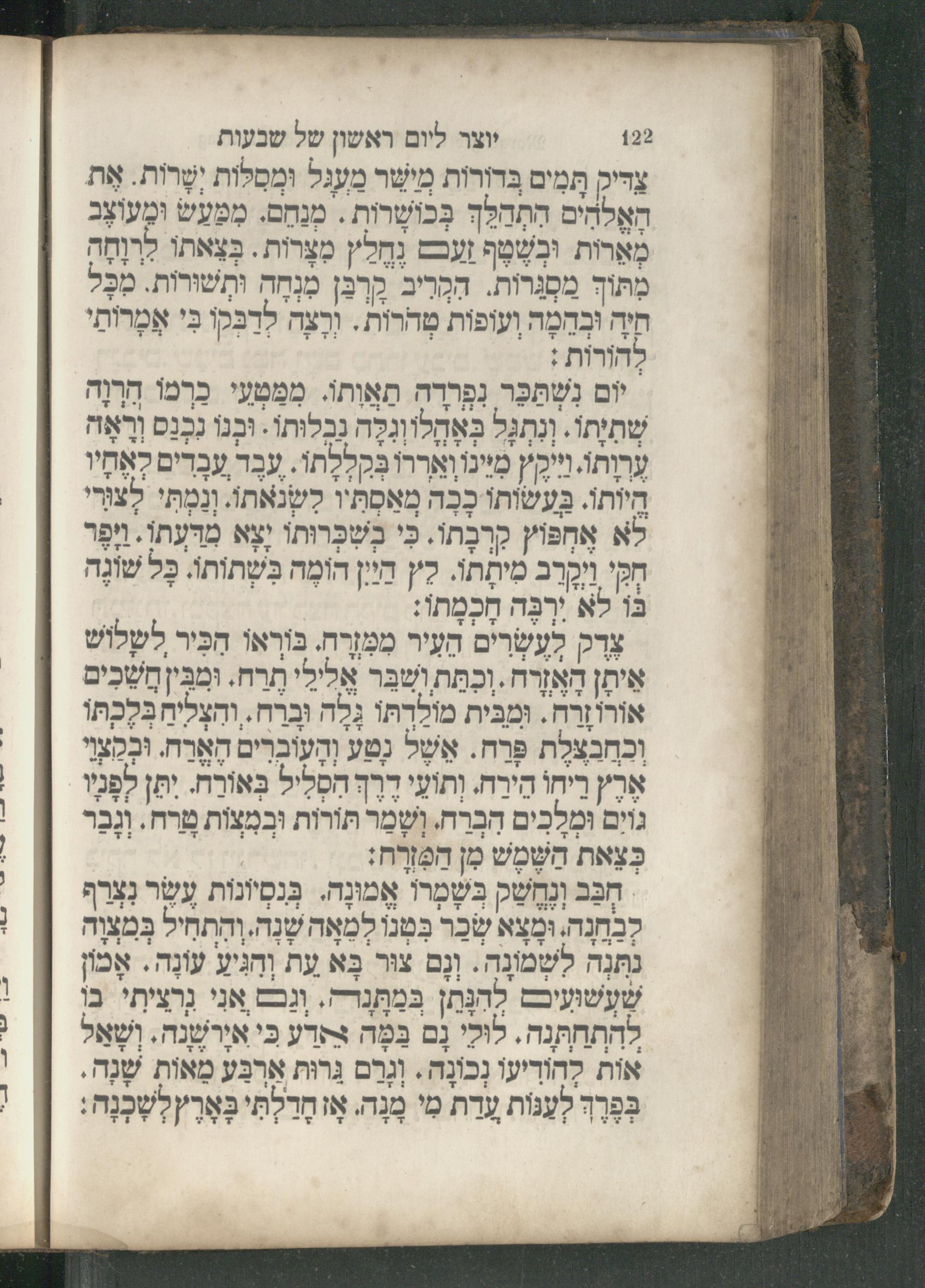 122 יוצר ליום ראשון של שבעות צריק תּמִים בדורות מישר מעגל וּמְמַלות יִטָרות. אֶת האָלהִים הַתְהַלֶך בְּכוּשרות. מנחַם. ממעש ומעוצֶב מָארות ובשף זעבם Oma מצרות. בְּצַאתו לַרוְחֶה מתוך MM 32 3907 AD ותשוּרות. מִבָּל חיה mama ועופות טהרות. וּרְצה He בִּי MD להורות: