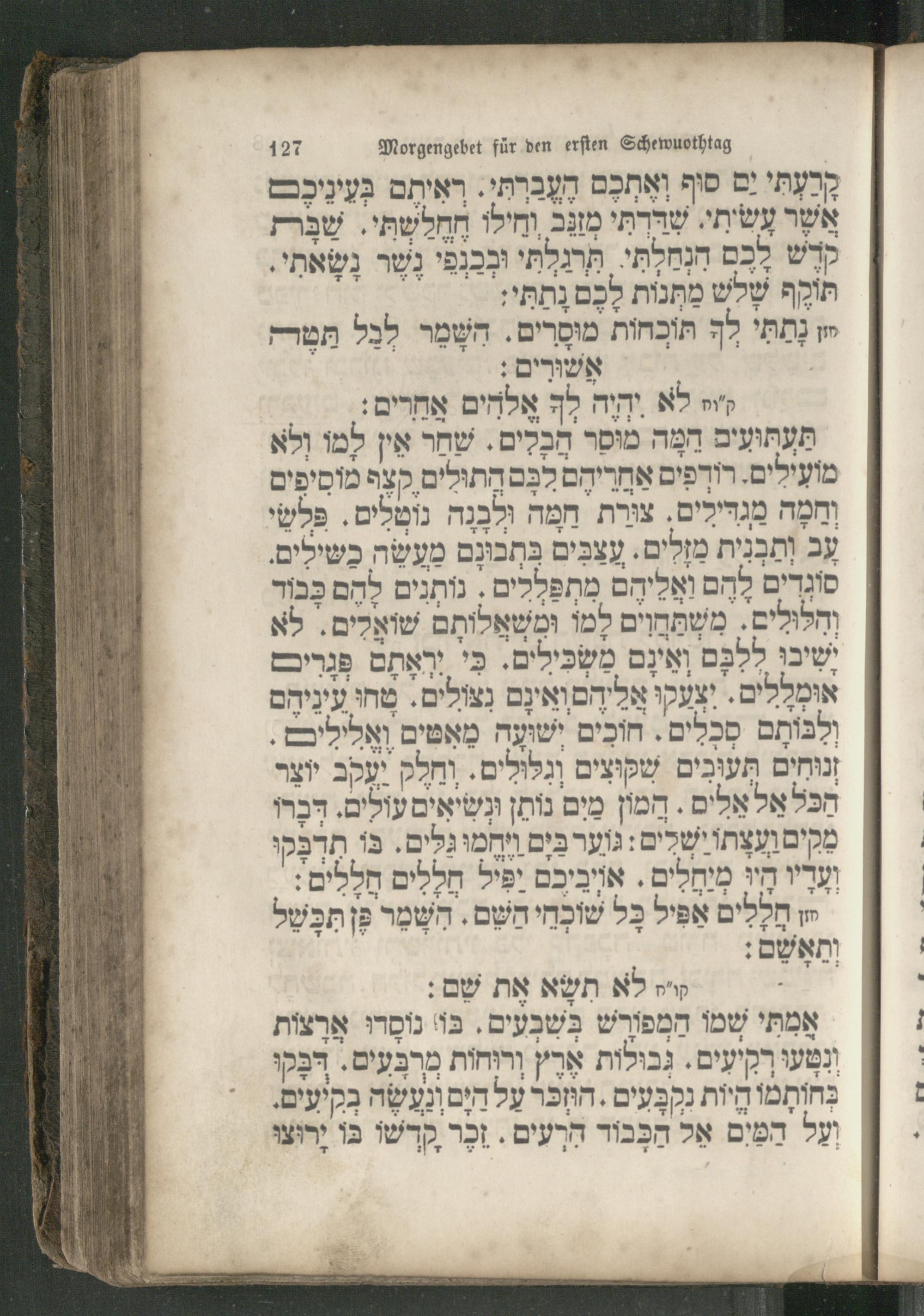 לא יִהְיֶה לְךָ אֱלֹהִים אֲחֵרִים: תַּעְתּוּעִים הֵמָּה מוּסַר הֲבָלִים. שַׁחַר אֵין לָמוֹ וְלֹא מוֹעִילִים. רוֹדְפִים אַחֲרֵיהֶם לִבָּם חֲתוּלִים קֶצֶף מוֹסִיפִים וְחַמָה מַגְדִּילִים. צוּרַת חַמָּה וּלְבָנָה נוֹטְלִים. פלשי עָב וְתַבְנִית מַזָלִים. עֲצַבִּים בִּתְבוּנָם מַעֲשֶׂה כַּשִׂילִים. סוֹגְדִים לָהֶם וַאֲלֵיהֶם מִתְפַּלְלִים. נוֹתְנִים לָהֶם כָּבוֹד וְהִלּוּלִים. מִשְׁתַּחֲוִים לָמוֹ וּמִשְׁאֲלוֹתָם שׁוֹאֲלִים. לֹא שִׁיבוּ לְלִבָּם וְאֵינָם מַשְׂכִּילִים. כִּי יִרְאָתָם פְּגָרִים אוּמְלָלִים. יַצְעֲקוּ אֲלֵיהֶם וְאֵינָם נְצוֹלִים. טָחוּ עֵינֵיהֶם וְלִבּוֹתָם סְכָלִים. חוֹכִים יְשׁוּעָה מֵאַטִים וְאֶלִילִים. נוּחִים תְּעוּבִים שְׁקוּצִים וְגִלּוּלִים. וְחֵלֶק יַעֲקֹב יוֹצֵר הַכֹּל אֵל אֵלִים. הֲמוֹן מַיִם נוֹתֵן וּנְשִׂיאִים עוֹלִים. דְּבָרוֹ מֵקִים וַעֲצָתוֹ יַשְׁלִים: גּוֹעַר בַּיָּם וַיְחֶמְוּ גְלִים. בּוֹ תִדְבָּקוּ וְעָדָיו הָיוּ מְיַחֲלִים. אוֹיְבֵיכֶם יַפִּיל חֲלָלִים חֲלָלִים: חזן חֲלָלִים אַפִּיל כָּל שׁוֹכְחֵי הַשֵׁם. הִשָּׁמֵר פֶּן תִּכָּשֵׁל