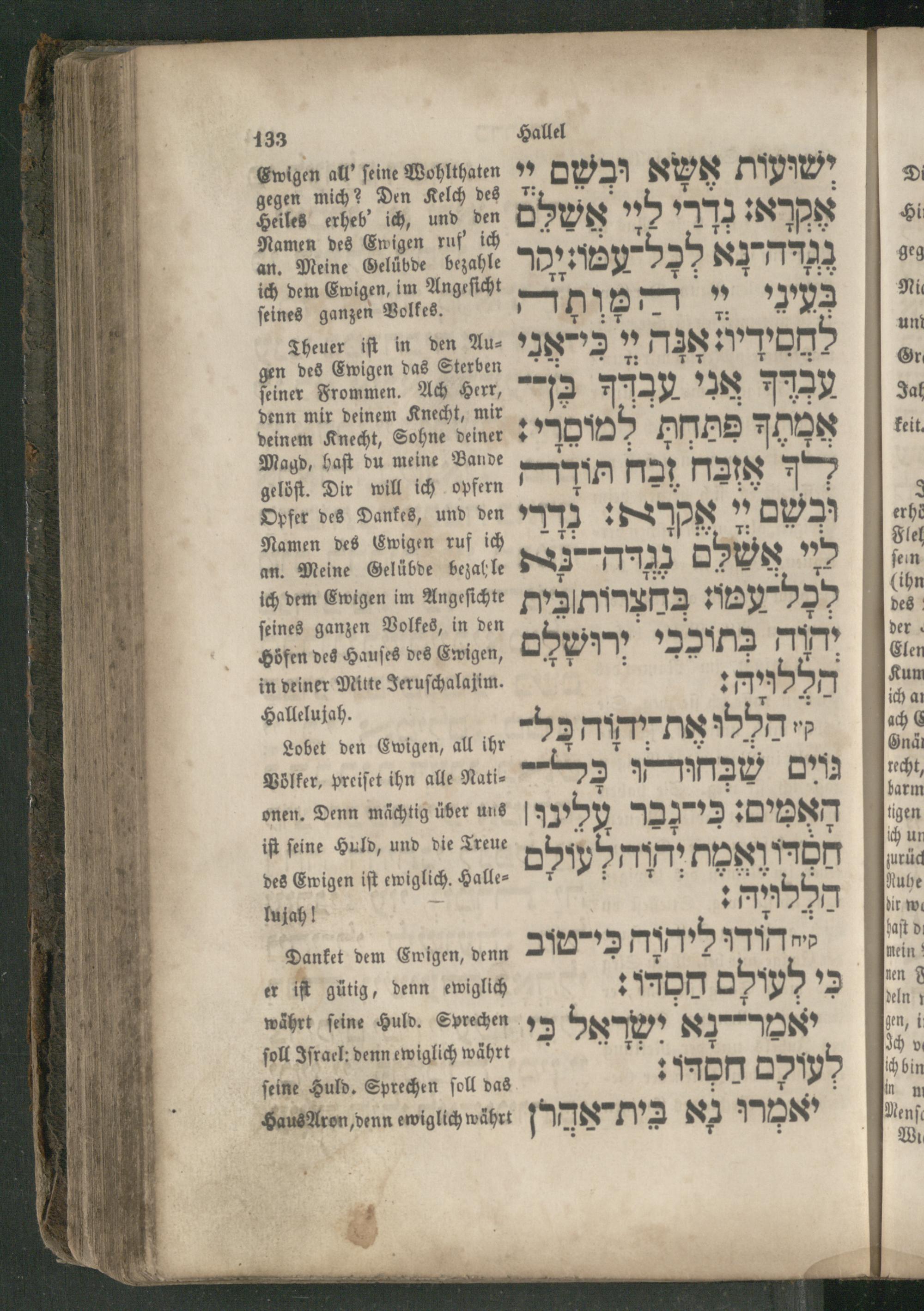 gelöſt. Dir will ich opfern Opfer des Dankes, und den Namen des Ewigen ruf ich an. Meine Gelübde bezahle ich dem Cwigen im Angeſichte ſeines ganzen Volkes, in den Höfen des Hauſes des Ewigen, in deiner Mitte Jeruſchalajim. Hallelujah.