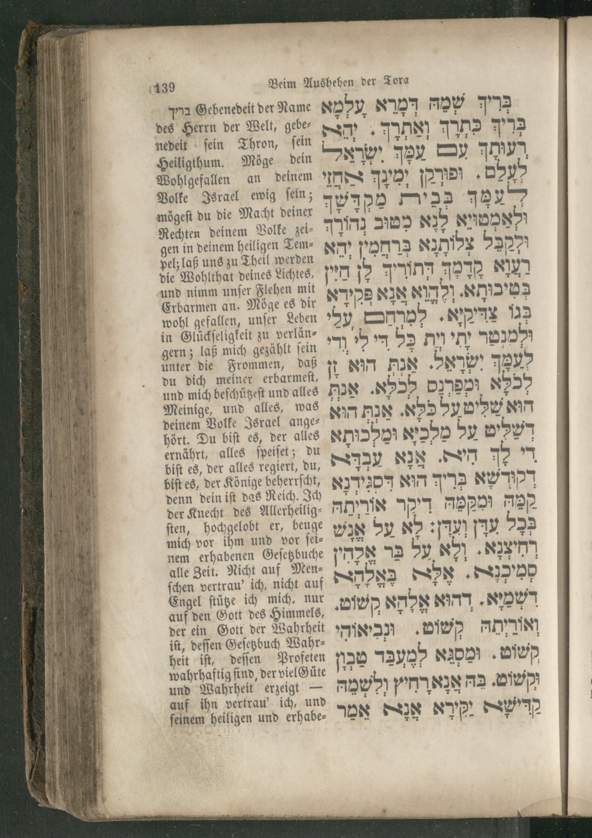Gebenedeit der Name בריך des Herrn der Welt, gebe⸗ nedeit ſein Thron, ſein Heiligthum. Möge dein Wohlgefallen an deinem Volke Israel ewig ſein; mögeſt du die Macht deiner Rechten deinem Volke zei⸗ gen in deinem heiligen Tem⸗ pel; laß uns zu Theil werden die Wohlthat deines Lichtes, und nimm unſer Flehen mit Erbarmen an. Möge es dir wohl gefallen, unſer Leben in Glückſeligkeit zu verlän⸗ gern; laß mich gezählt ſein unter die Frommen, daß du dich meiner erbarmeſt, und mich beſchützeſt und alles Meinige, und alles, was deinem Volke Israel ange⸗ hört. Du biſt es, der alles ernährt, alles ſpeiſet; du biſt es, der alles regiert, du, biſt es, der Könige beherrſcht, denn dein iſt das Reich. Ich der Knecht des Allerheilig⸗ ſten, hochgelobt er, beuge mich vor ihm und vor ſei⸗ nem erhabenen Geſetzbuche alle Zeit. Nicht auf Men⸗ ſchen vertrau' ich, nicht auf Engel ſtütze ich mich, nur auf den Gott des Himmels der ein Gott der Wahrheit iſt, deſſen Geſetzbuch Wahr⸗ heit iſt, deſſen Profeten wahrhaftig find, der viel@üte und Wahrheit erzeigt— auf ihn vertrau' ich, und ſeinem heiligen und erhabe⸗