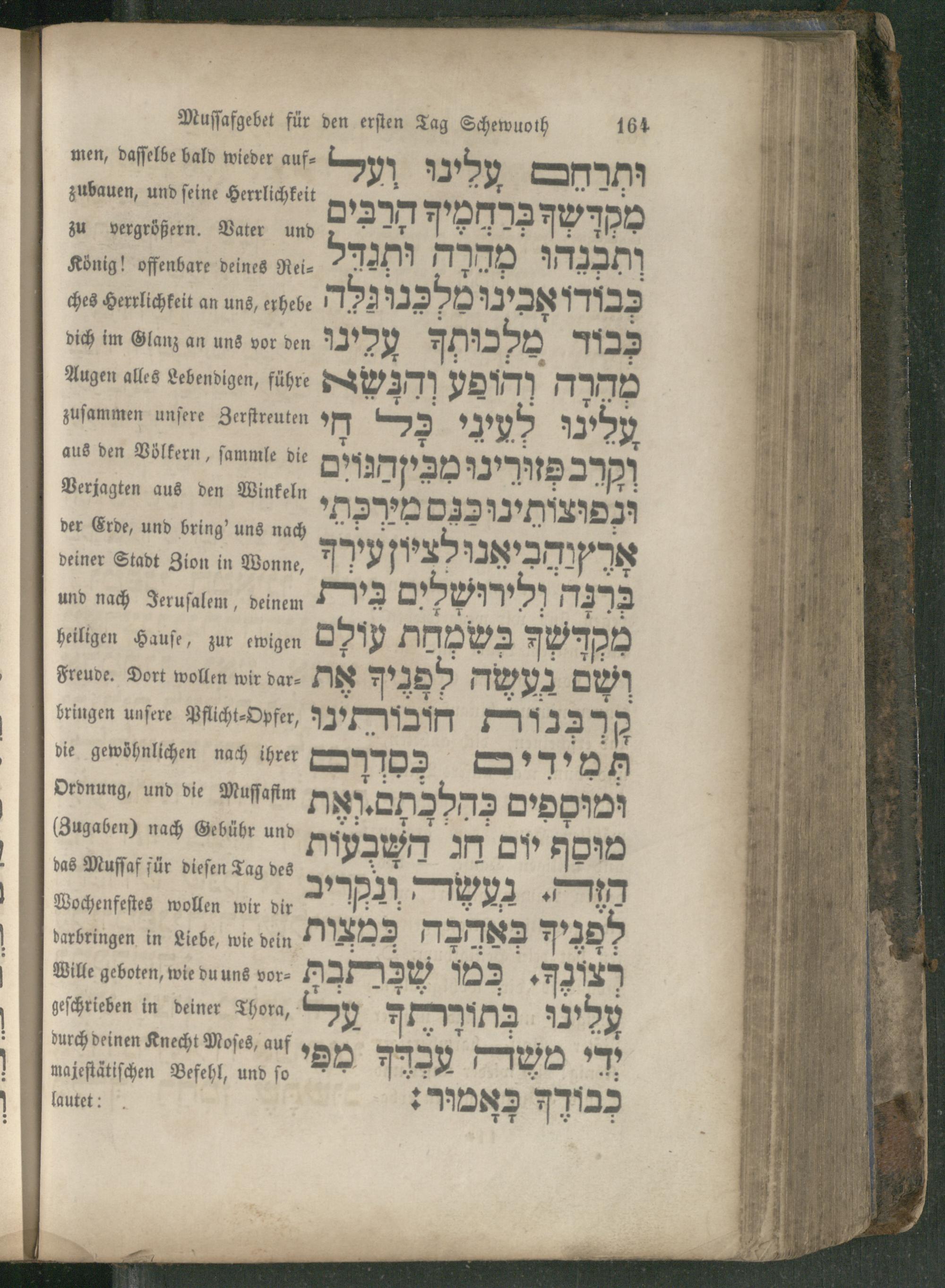 Freude. Dort wollen wir dar⸗ נעשה 755 אֶת DW bringen unſere Pflicht⸗Opfer, חובותתינו. 77 die gewöhnlichen nach ihrer—— מ, די 5 Ordnung, und die Muſſaſtm ומוּסְפִים בְּהַלְבָתֶם.וּאֶת Zugaben) nach Gebühr und מוסף יים הג השְבעות