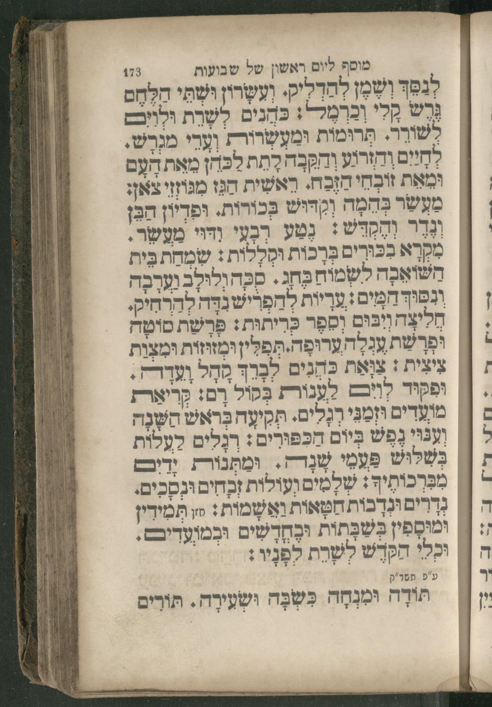 מוסף ליום ראשון של שבועות 173 לנפך ושמן PP ושרי שת הַלְחֶם Wa קָלי וכרמלל: בחָנים לְשְרֶת END לשורר. תרוּמות ומעשרורת וְעָרִי מגרש. לְחָיִים והזרגע orm MAR לכהן מאת הָעָם ומאת זובחי הזֶבח. ראשית FAT מגוזזיצאן: מעשר בְּחְמָה וקדוּש בְכורות. וּפדֶיון an ונר a voz: den ודוי מפשר. , max mh) לשמוח בחג. םכה וְלוּלֶב man