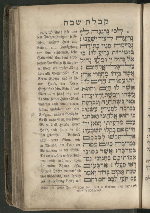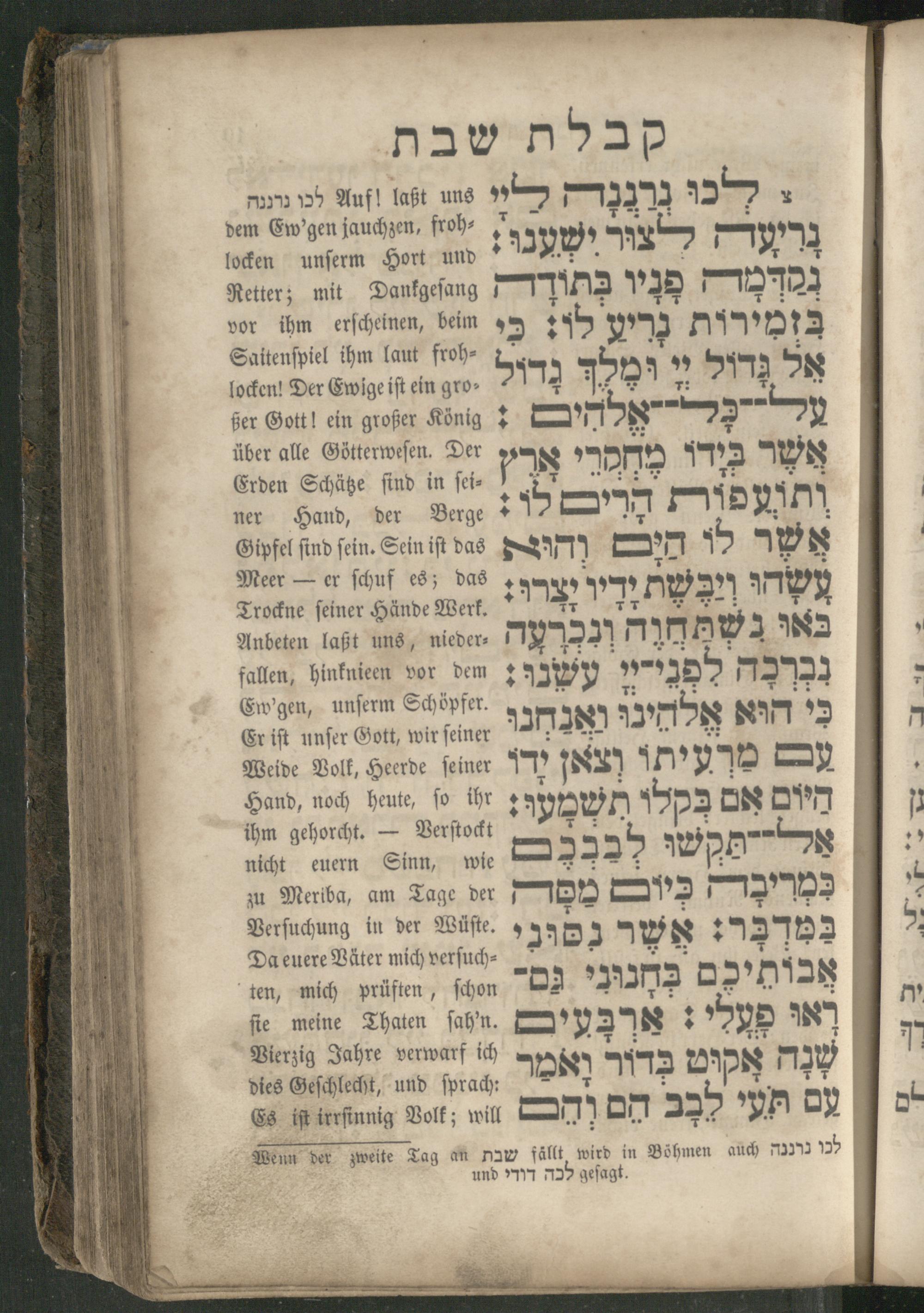 Auf! laßt uns לכו נרננה dem Cw'gen jauchzen, froh⸗ locken unſerm Hort und Retter; mit Dankgeſang vor ihm erſcheinen, beim Saitenſpiel ihm laut froh⸗ locken! Der Ewige iſt ein gro⸗ ßer Gott! ein großer König: über alle Götterweſen. Der Erden Schätze ſind in ſei⸗ ner Hand, der Berge Gipfel find fein. Sein iſt das Meer— er ſchuf es; das Trockne ſeiner Hände Werk. Anbeten laßt uns, nieder⸗ fallen, hinknieen vor dem Ew'gen, unſerm Schöpfer. Er iſt unſer Gott, wir ſeiner Weide Volk, Heerde ſeiner Hand, noch heute, ſo ihr ihm gehorcht.— Verſtockt nicht euern Sinn, wie zu Meriba, am Tage der Verſuchung in der Wüſte. Da euere Väter mich verſuch⸗ ten, mich prüften, ſchon fie meine Thaten ſah'n. Vierzig Jahre verwarf ich dies Geſchlecht, und ſprach: Es iſt irrſinnig Volk; will