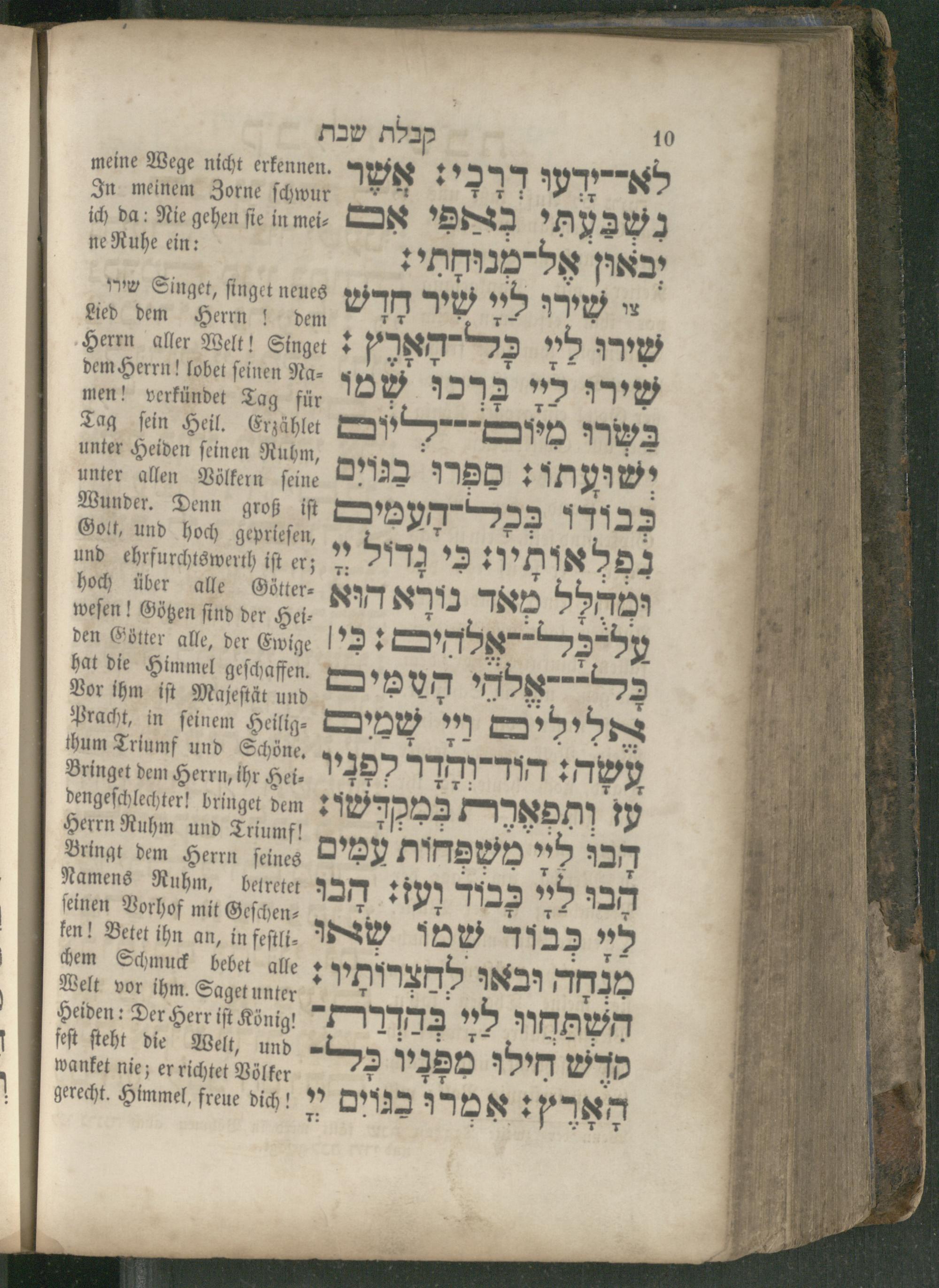 Singet, ſinget neues שירו Lied dem Herrn! dem Herrn aller Welt! Singet dem Herrn! lobet ſeinen Na⸗ men! verkündet Tag für Tag ſein Heil. Erzählet unter Heiden ſeinen Ruhm, unter allen Völkern ſeine Wunder. Denn groß iſt Golt, und hoch geprieſen, und ehrfurchtswerth iſt er; hoch über alle Gitter- weſen! Götzen find der Hei⸗ den Götter alle, der Ewige hat die Himmel geſchaffen. Vor ihm iſt Majeſtät und Pracht, in ſeinem Heilig⸗ thum Triumf und Schöne. Bringet dem Herrn, ihr Hei⸗ dengeſchlechter! bringet dem Herrn Ruhm und Triumfl Bringt dem Herrn ſeines Namens Ruhm, betretet feinen Vorhof mit Geſchen⸗ ken! Betet ihn an, in feſtli⸗ chem Schmuck bebet alle Welt vor ihm. Saget unter Heiden: Der Herr iſt König! feft ſteht die Welt, und wanket nie; er richtet Völker gerecht. Himmel, freue dich!